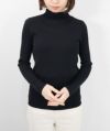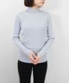 編地は14ゲージのリブ編み。糸を2本取りで使用することでほどよい厚みと上品な光沢が生まれます。ほどよく幅のあるワイドリブがコーディネートのアクセントに。首元は身頃から編み続きのハイネック。衿ぐりに縫い目がないから見た目も着心地もすっきりしています。