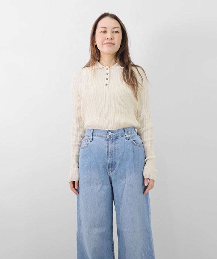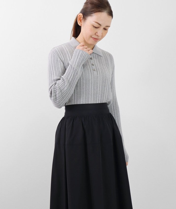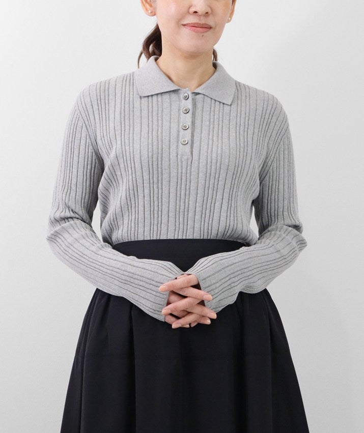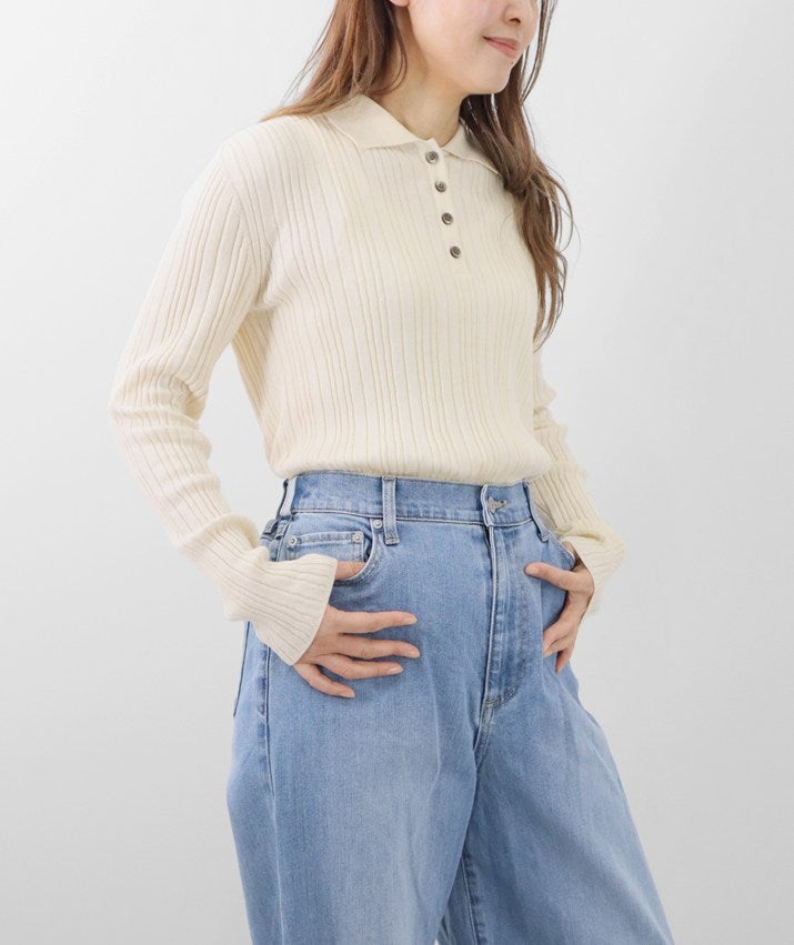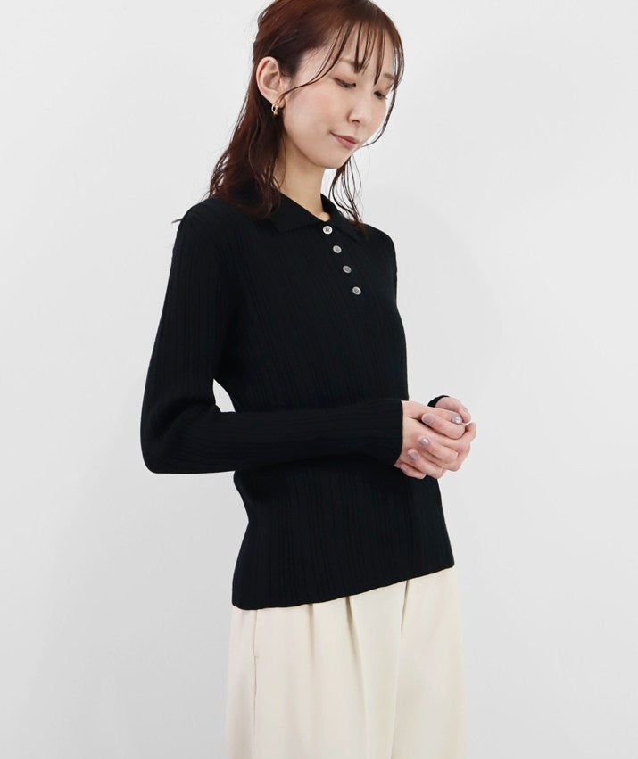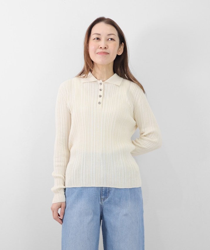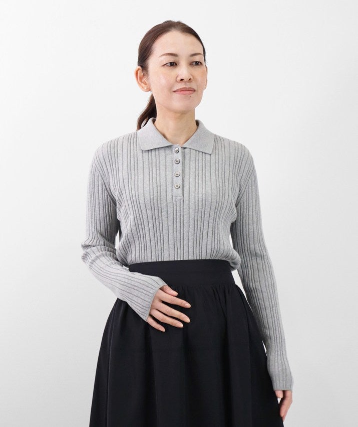 16ゲージで編み立てた、表情豊かなランダムリブのポロニット。襟付きのデザインがきちんと感を添えつつ、カジュアルにも着まわせる一枚です。身体のラインを拾いすぎない、ほどよいフィット感とやわらかな着心地に仕上げました。インでもアウトでもバランスよく決まる丈感で、ボトムスを選ばず幅広いコーディネートに活躍します。