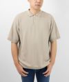 編地は14ゲージのハニカム柄編み。肌との接地面が少なく通気性に優れています。ややゆったりめのシルエットで、リラックス感のある着心地。シンプルなデザインの中に、裾や袖口のリブ組織がアクセントになっています。衿はリンキングづけ、前立ては総針で、ニットらしいディテールにもこだわりました。