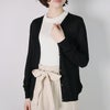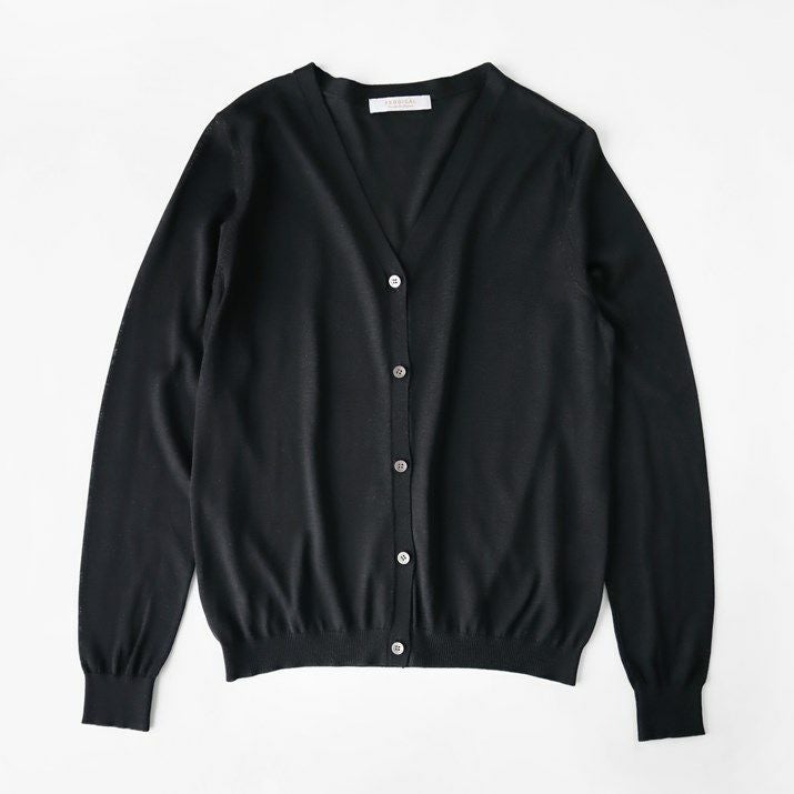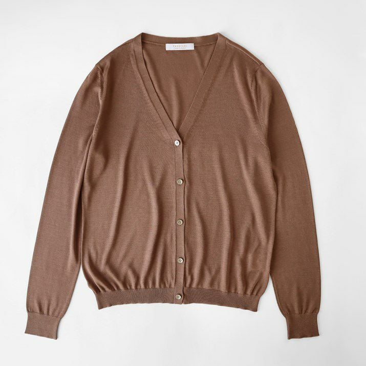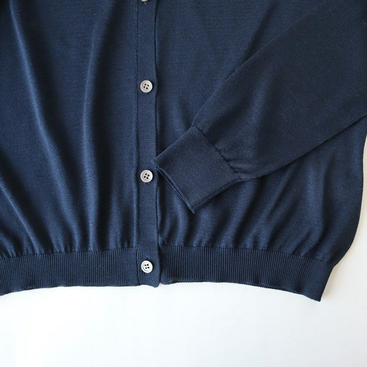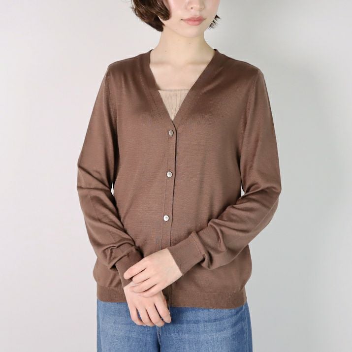 シンプルで飽きのこないベーシックなデザインのVネックカーディガン。編地は16ゲージの天竺編み。薄手で透け感があります。シルクならではの上品な光沢と滑らかな肌触りが魅力です。すっきりとしたシルエットはきちんと感のある印象で、オフィスカジュアルにもぴったり。