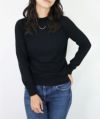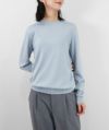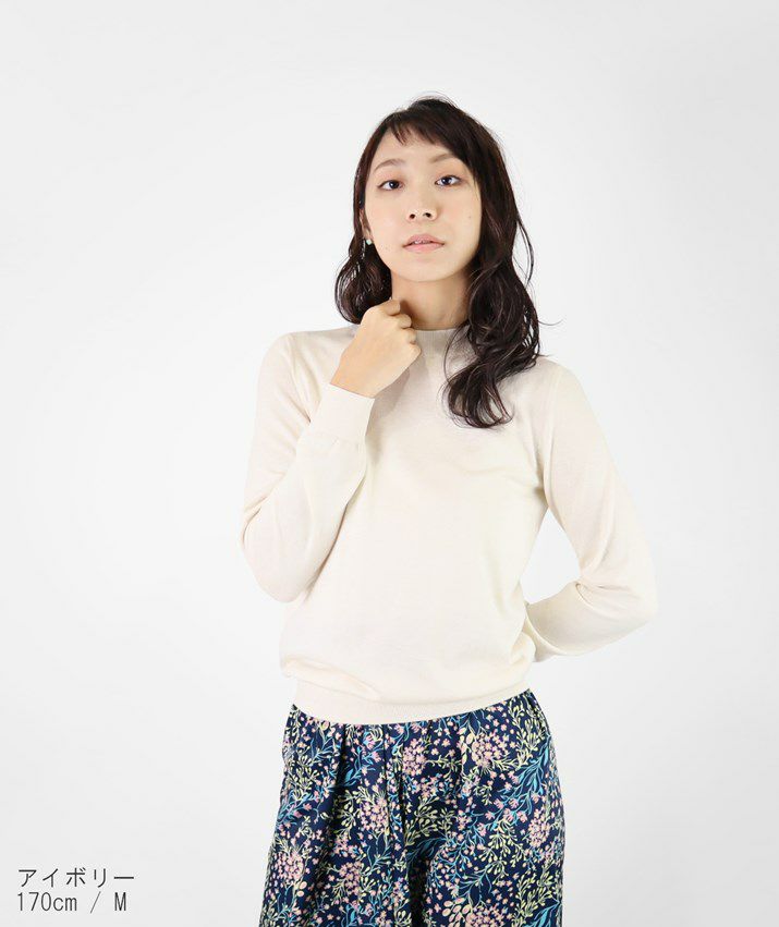 編地は16ゲージの天竺編みで、薄手で光沢感があり上品な印象に仕上げました。淡色はやや透け感があります。アクセサリーが映える上品なハイネックは、程よい高さで顔まわりをすっきり見せてくれます。とろみ感のある素材から生まれるドレープが女性らしい雰囲気の一枚です。