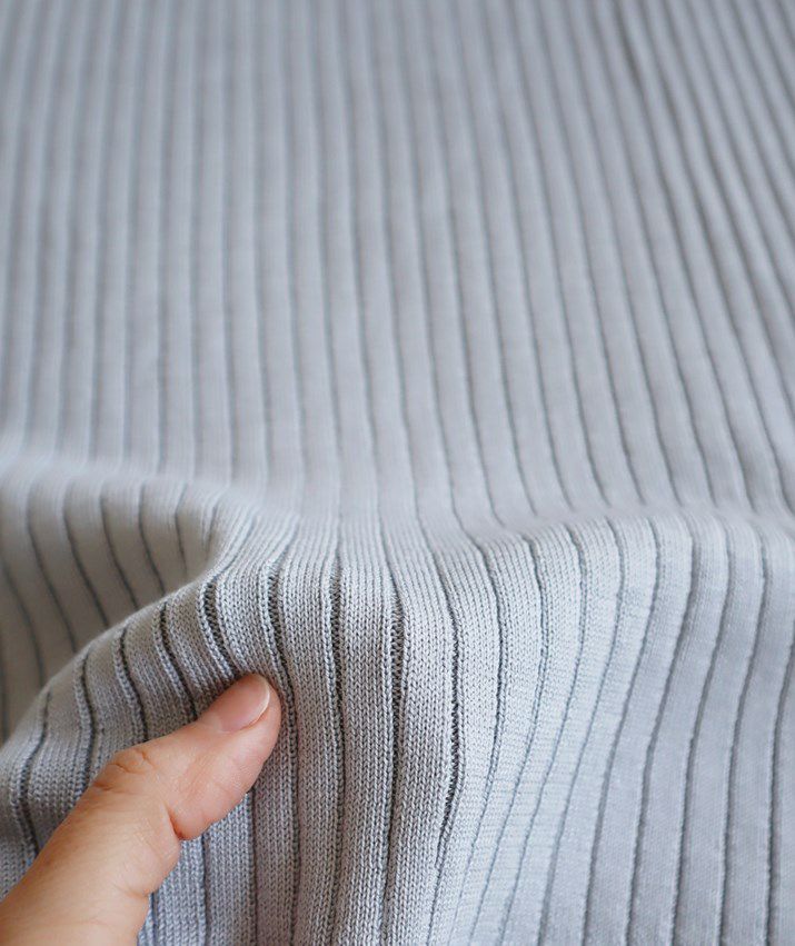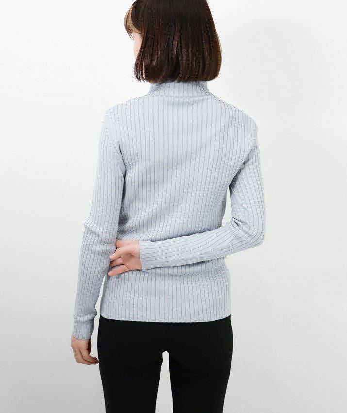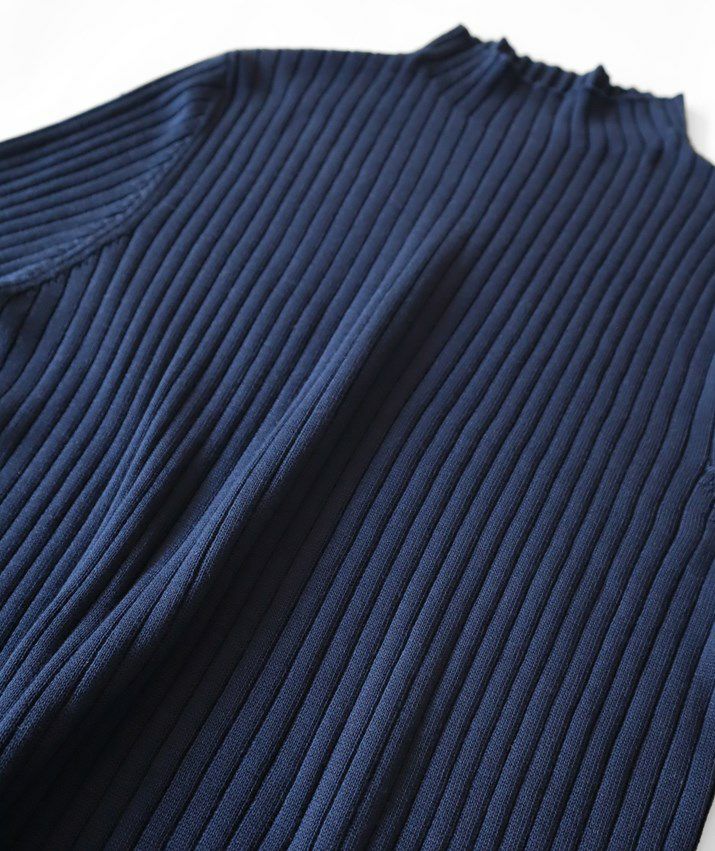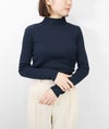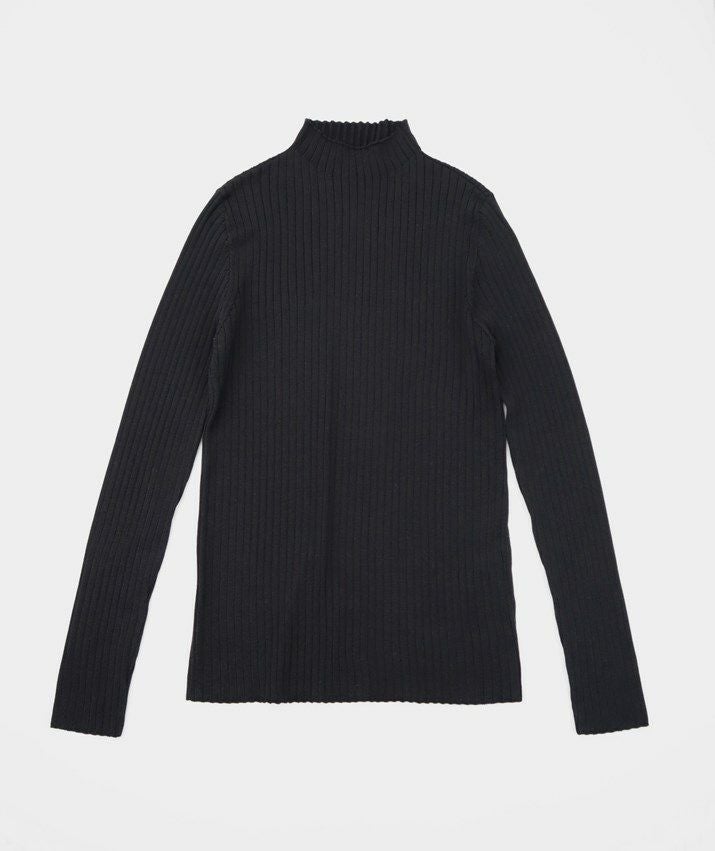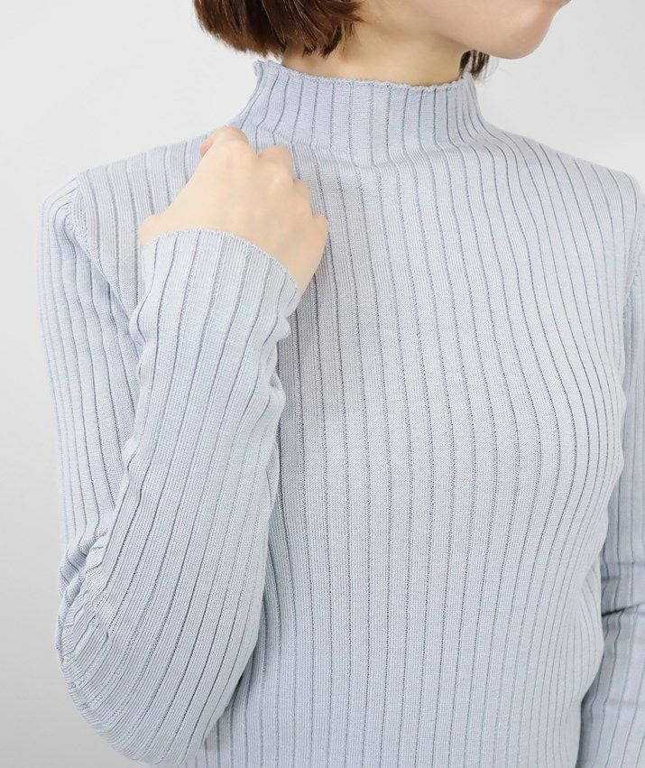 編地は14ゲージのリブ編み。糸を2本取りで使用することでほどよい厚みと上品な光沢が生まれます。ほどよく幅のあるワイドリブがコーディネートのアクセントに。首元は身頃から編み続きのハイネック。衿ぐりに縫い目がないから見た目も着心地もすっきりしています。