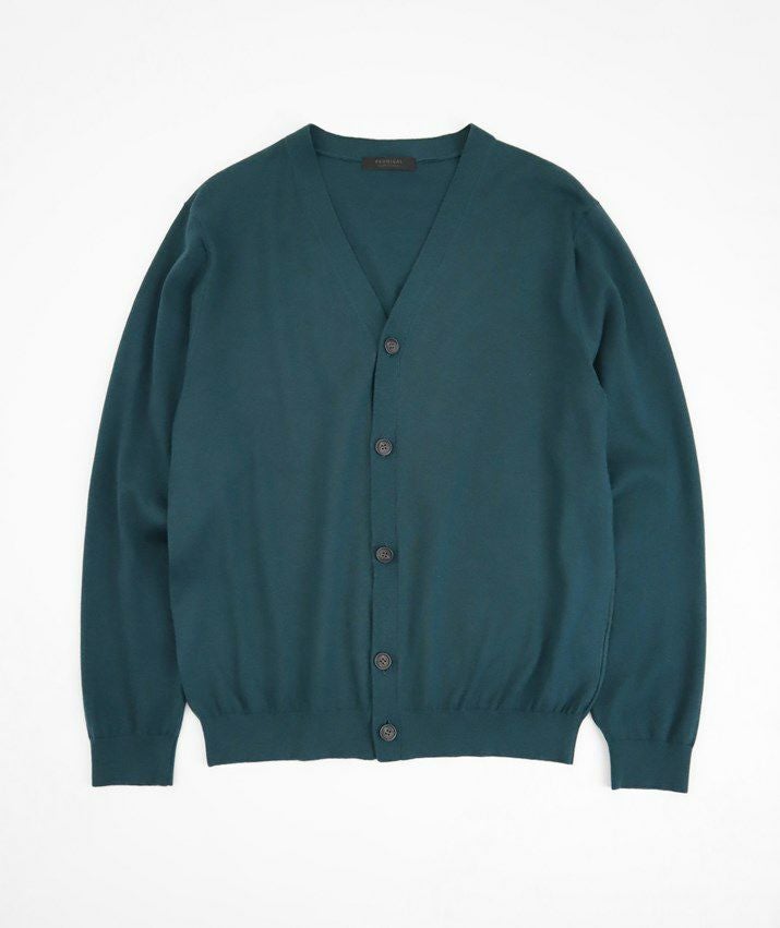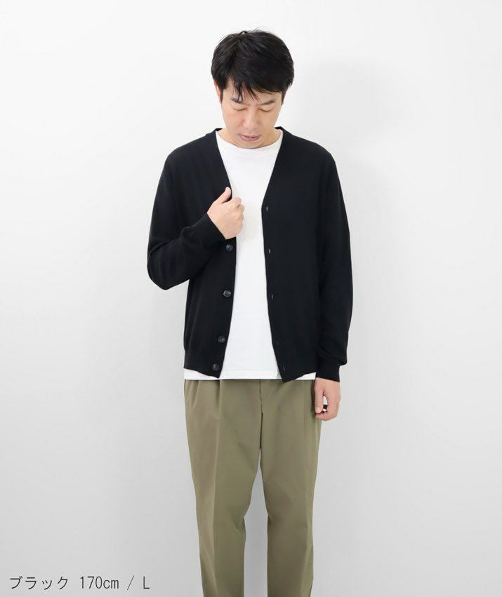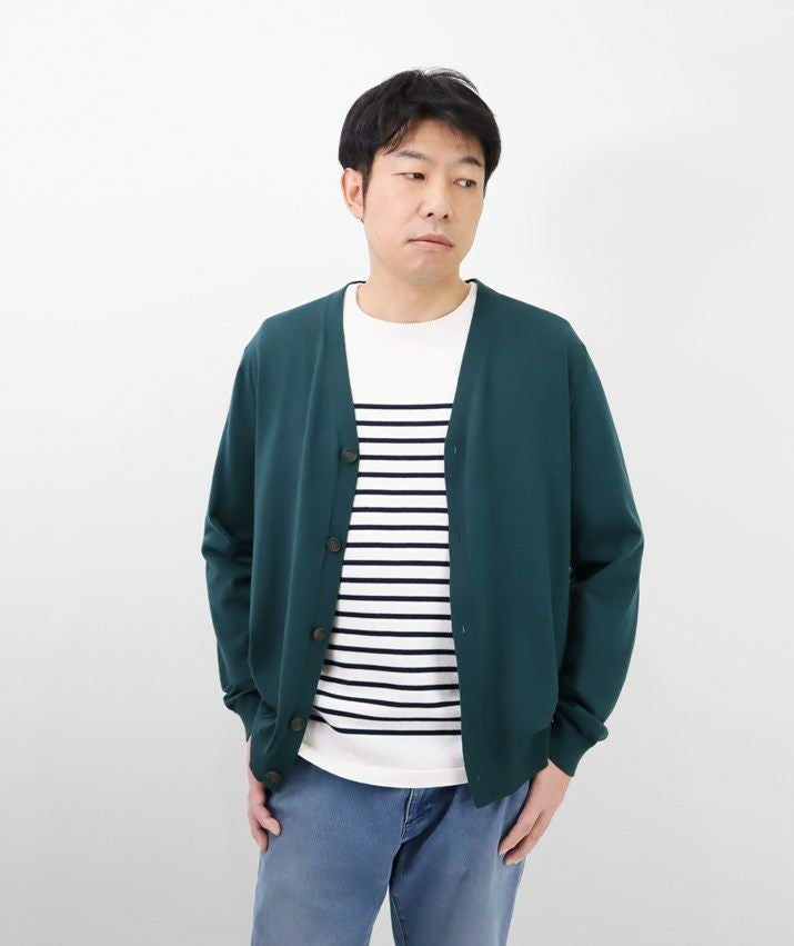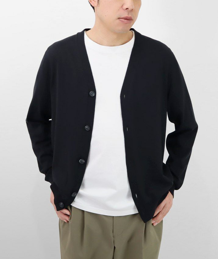 シンプルで飽きのこないベーシックなデザインのVネックカーディガン。16ゲージの天竺編みで、編み目の目立たないプレーンな表情に。薄手でさらっと着られるので、インナーを選ばず着まわしやすい万能アイテムです。
