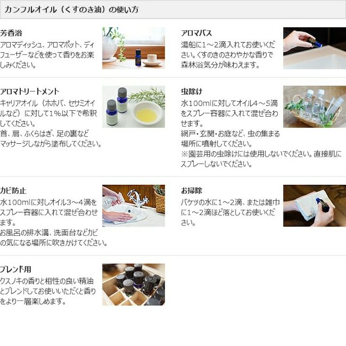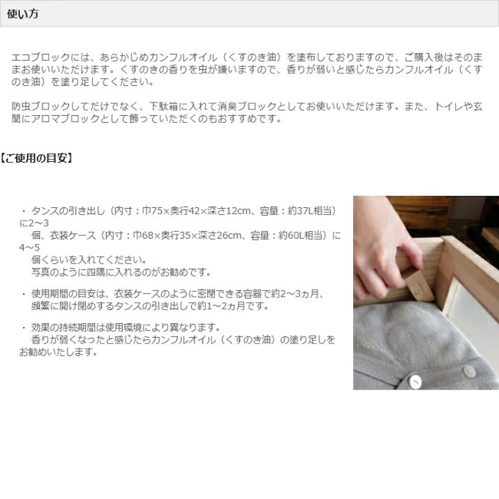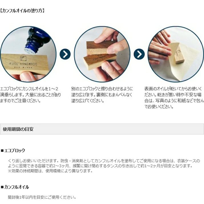 【注意事項】 *他の防虫剤と一緒に使用しないでください。衣類を変色させる場合があります。 *天然木を使用しておりますので、それぞれ色合いや風合いが異なります。 *ブロックの黒い斑点は、楠特有のもので汚れではありません。 *カンフルオイルは、純度の高いエッセンシャルオイルです。原液を飲んだり、直接肌につけたりしないでください。 *プラスチックやマニキュアを溶かす場合がありますのでご注意ください。 *ビンからオイルが出にくかったり、大量に出たりすることがありますので、ご注意ください。 *オイルがこぼれた場合はすぐにティッシュなどで拭き取ってください。 *直射日光・火気を避け、お子様の手の届かないところで使用、保管してください。 *高血圧、ぜんそく、てんかん、アレルギー体質の方、敏感肌の方、妊娠中の方、乳幼児などはご使用をお控えください。 ・ 使用中に気分が悪くなったり、目や鼻に強い刺激を感じた場合は、ただちに使用を止め、空気の入れ換えをしてください。 ・ アロマポットでご使用になる場合は、水で1%以下に希釈してご使用ください。 ・ 気温が下がるとオイルのカンフル成分が結晶化して白い沈殿物ができますが、品質には問題ありません。 ・ 万が一飲み込んだ場合は、すぐに水を飲んで応急処置をし、医師の診断を受けてください。