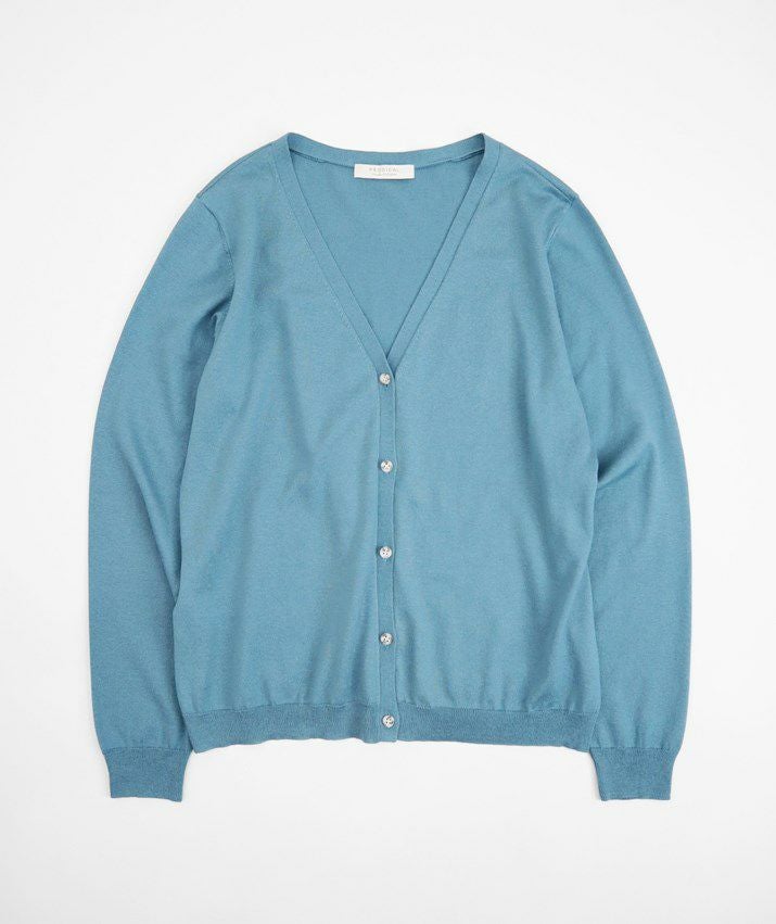シンプルで飽きのこないベーシックなデザインのVネックカーディガン。編地は14ゲージの天竺編み。しなやかで細かく均一な編み目で、一目見るだけで上質感が伝わる仕上がりに。薄手でやや透け感があります。すっきりとしたシルエットはきちんと感のある印象で、オフィスカジュアルにもぴったり。