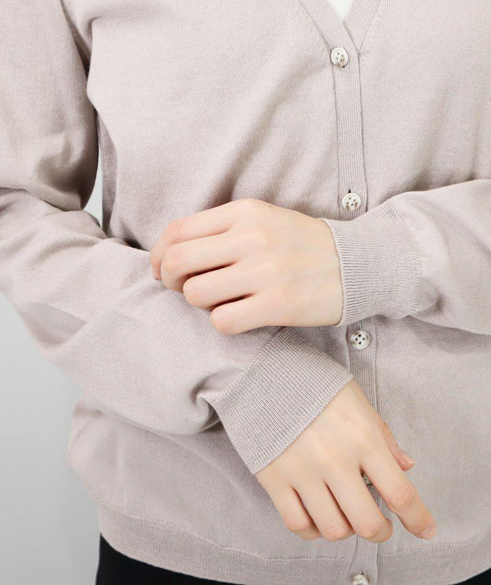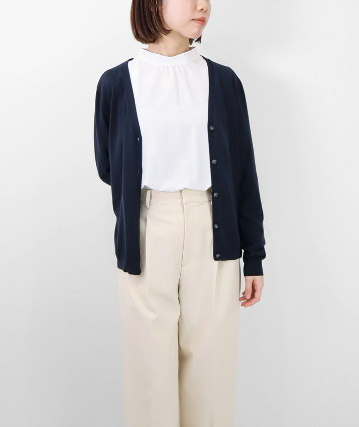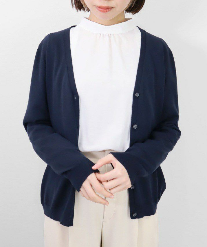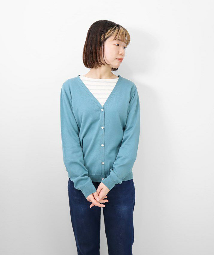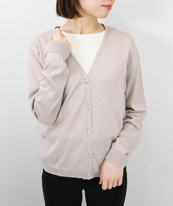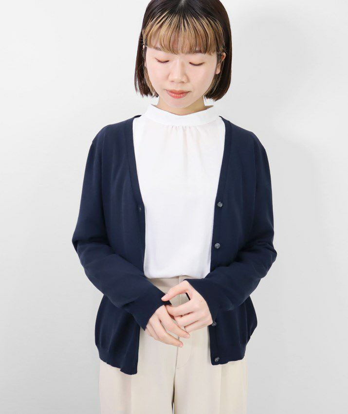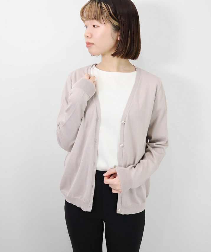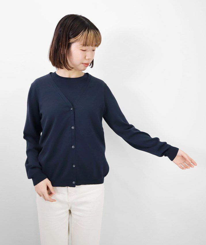 シンプルで飽きのこないベーシックなデザインのVネックカーディガン。編地は14ゲージの天竺編み。しなやかで細かく均一な編み目で、一目見るだけで上質感が伝わる仕上がりに。薄手でやや透け感があります。すっきりとしたシルエットはきちんと感のある印象で、オフィスカジュアルにもぴったり。