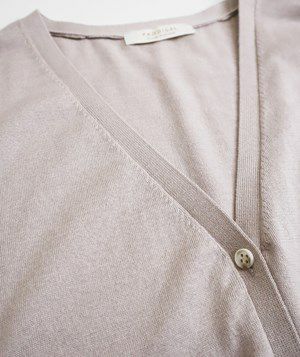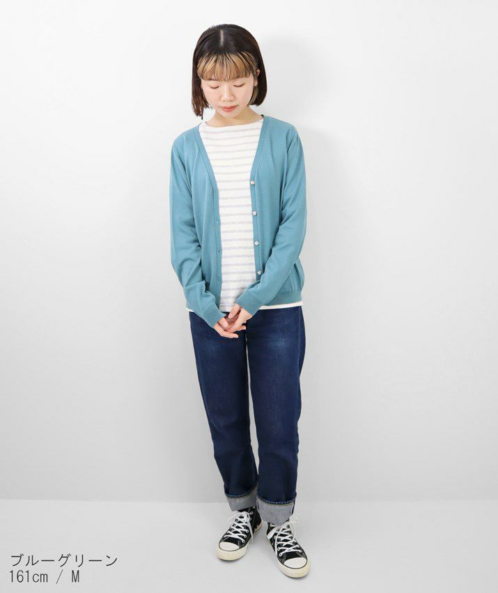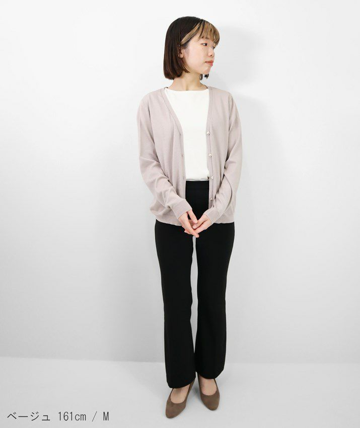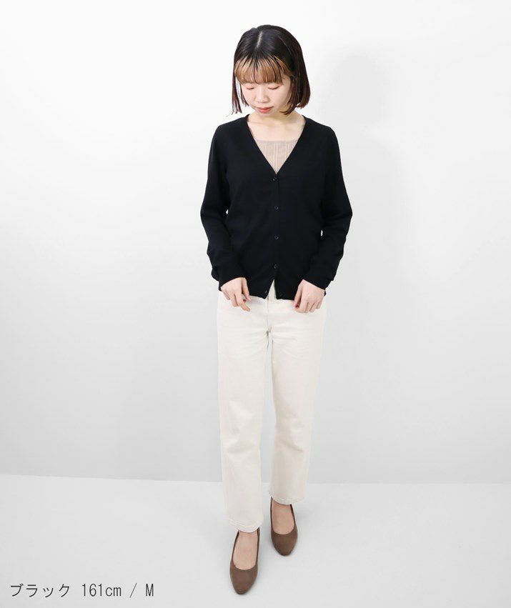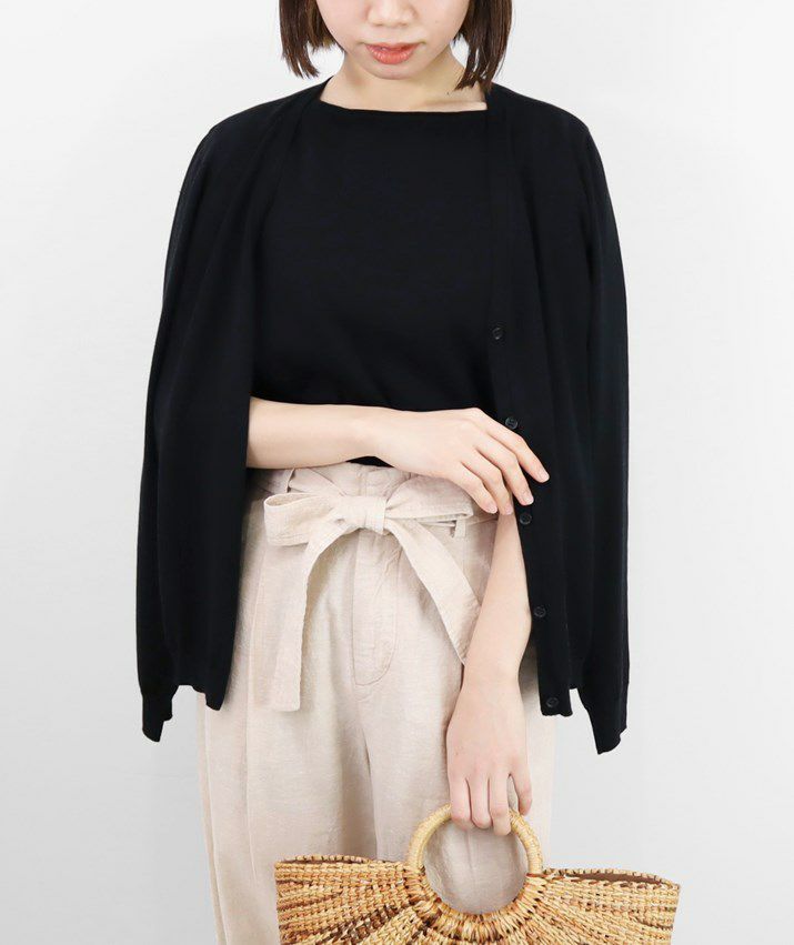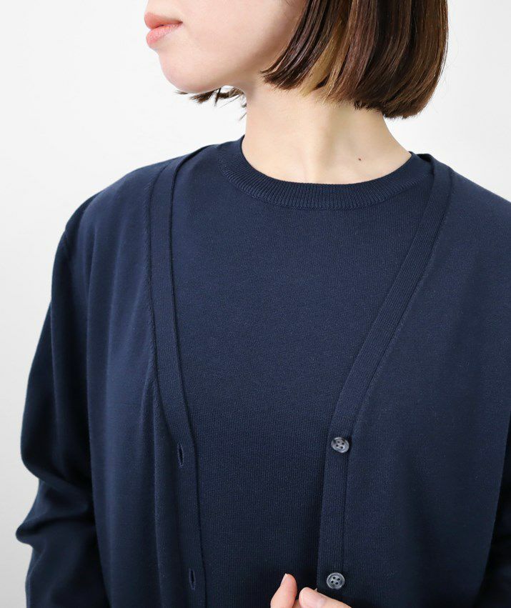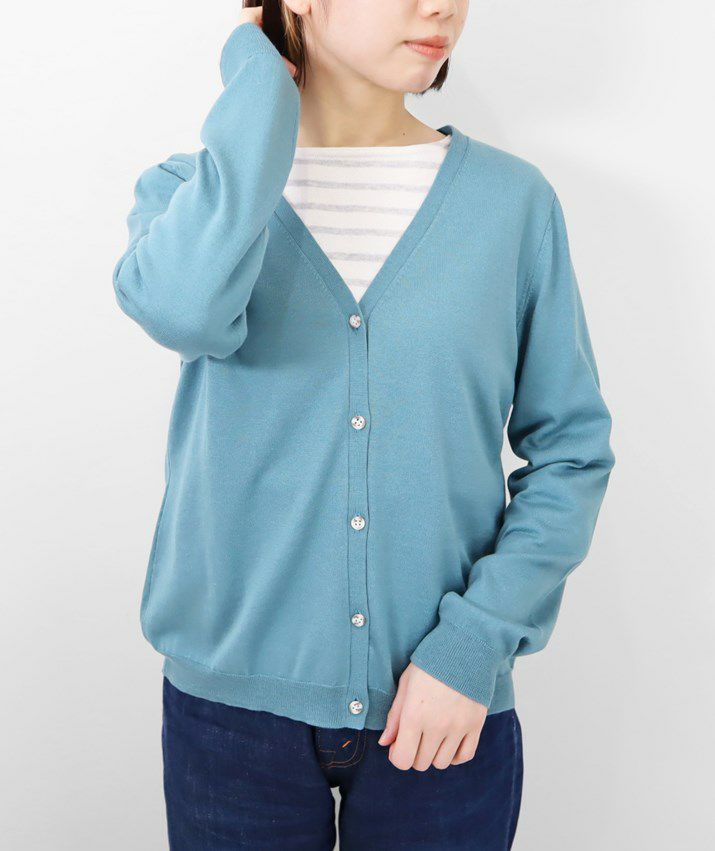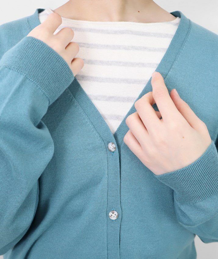 シンプルで飽きのこないベーシックなデザインのVネックカーディガン。編地は14ゲージの天竺編み。しなやかで細かく均一な編み目で、一目見るだけで上質感が伝わる仕上がりに。薄手でやや透け感があります。すっきりとしたシルエットはきちんと感のある印象で、オフィスカジュアルにもぴったり。