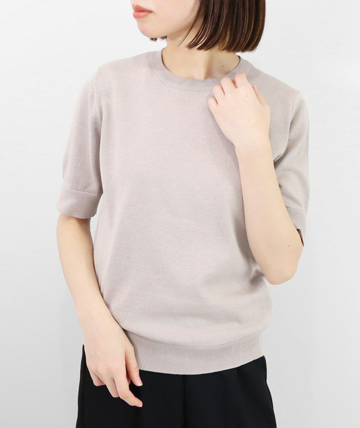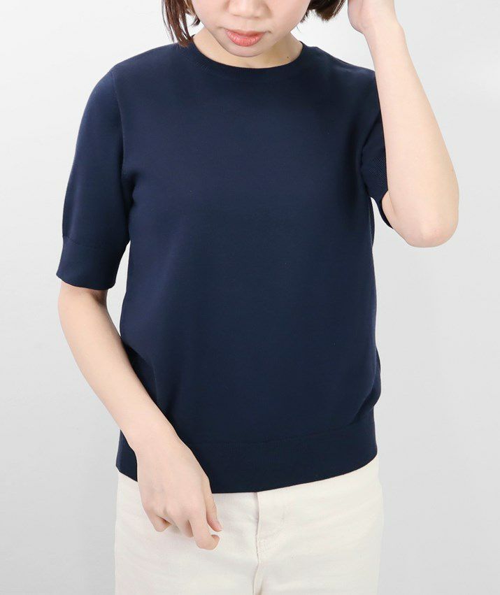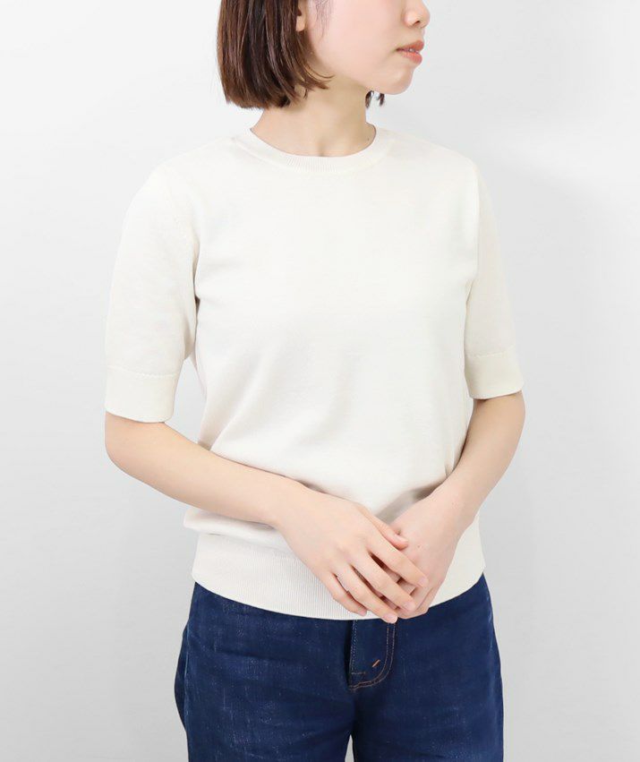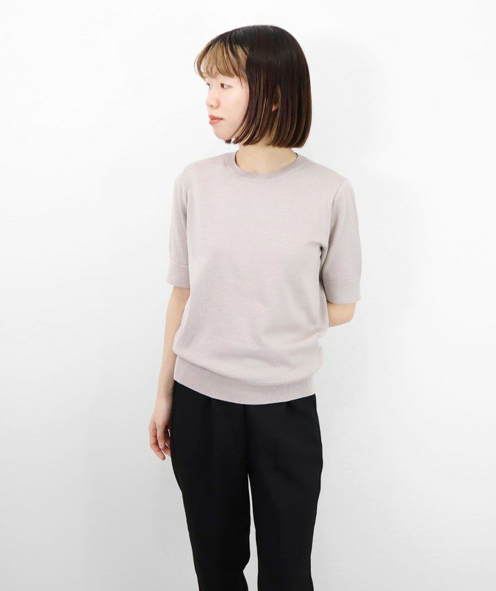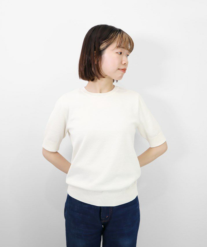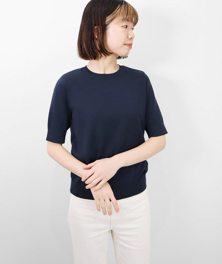 Tシャツのように気軽に着られる、さらりとした肌触りのサマーニット。編地は14ゲージの天竺編み。しなやかで細かく均一な編み目が上品な印象を与えます。シルク混ならではのやさしい光沢感で、カジュアルになりすぎず、きれいめなスタイルに仕上がります。衿ぐり・袖口・裾はリブ仕様で、すっきりとしたシルエットに。シンプルで洗練されたデザインだから、流行に左右されず長くご愛用いただけます。
