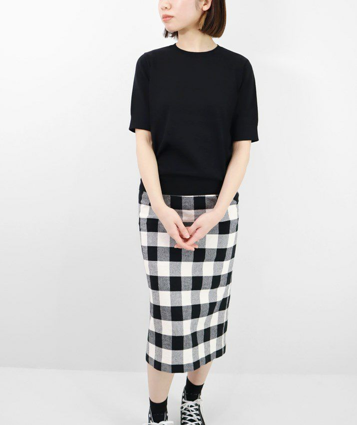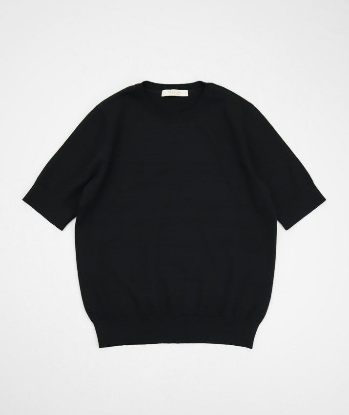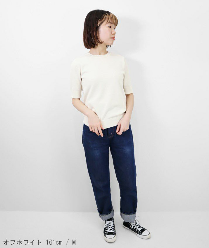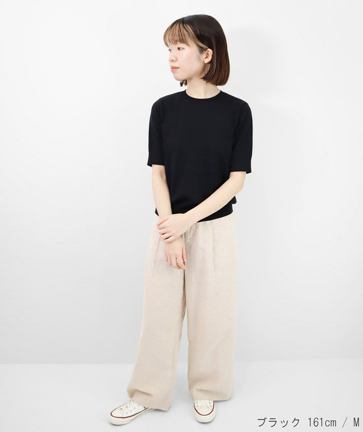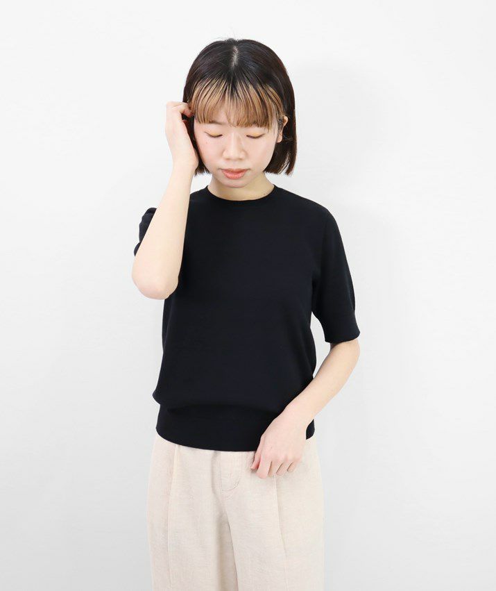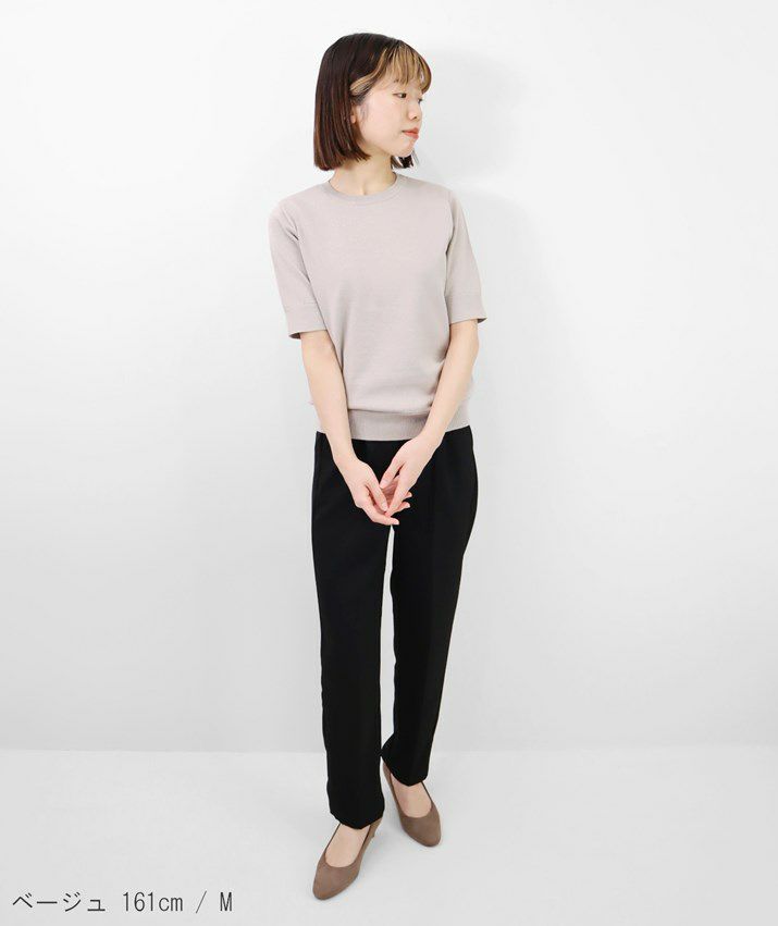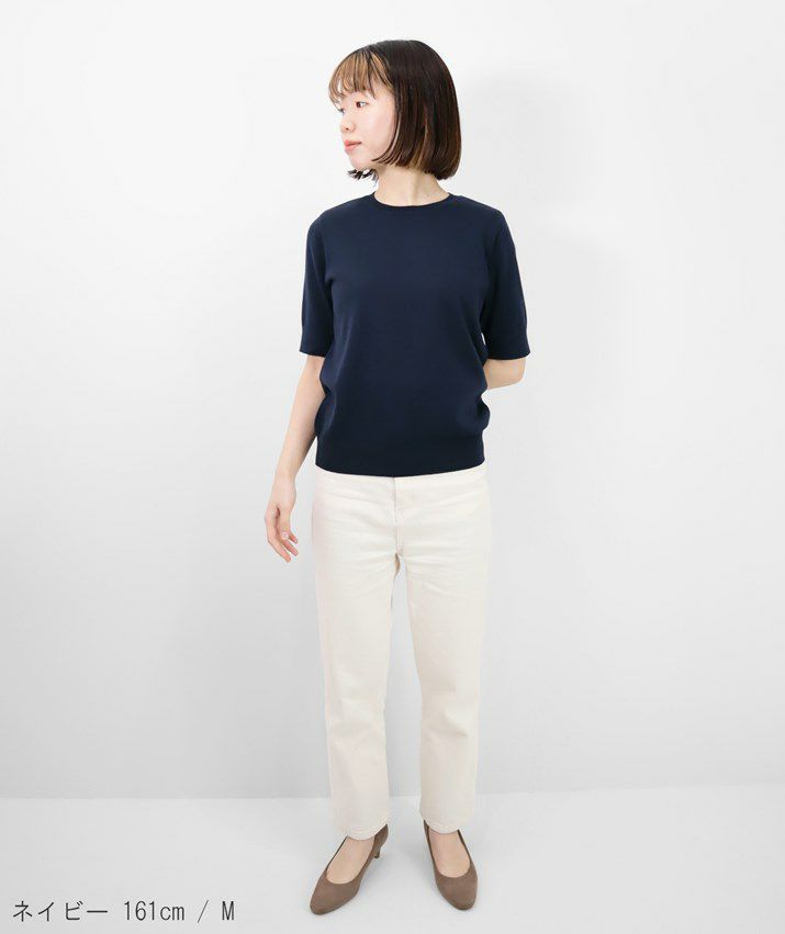 Tシャツのように気軽に着られる、さらりとした肌触りのサマーニット。編地は14ゲージの天竺編み。しなやかで細かく均一な編み目が上品な印象を与えます。シルク混ならではのやさしい光沢感で、カジュアルになりすぎず、きれいめなスタイルに仕上がります。衿ぐり・袖口・裾はリブ仕様で、すっきりとしたシルエットに。シンプルで洗練されたデザインだから、流行に左右されず長くご愛用いただけます。