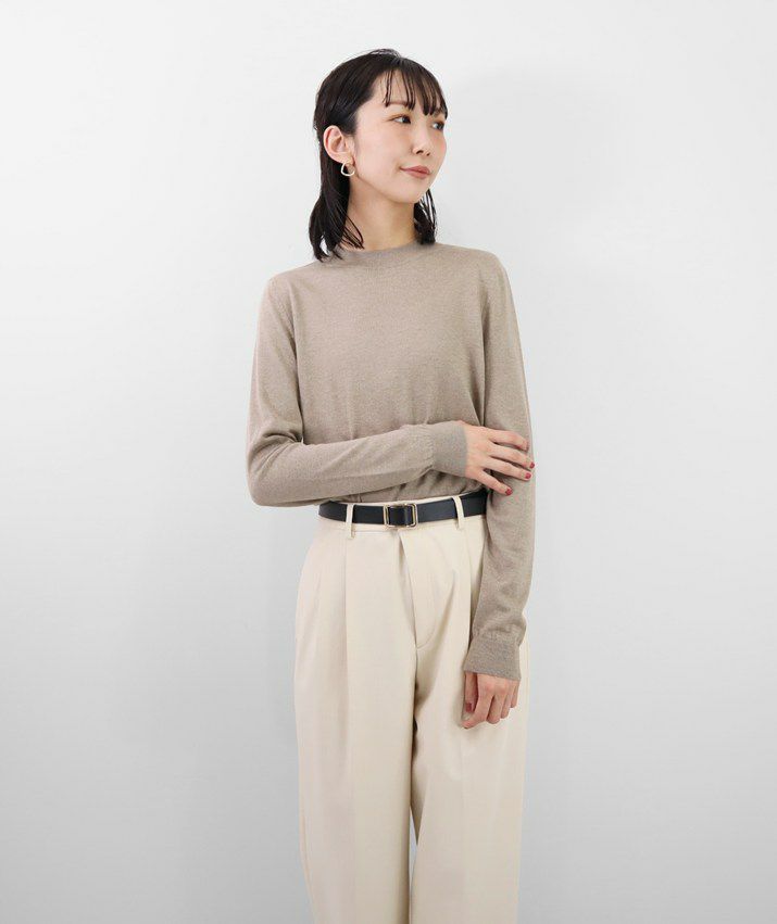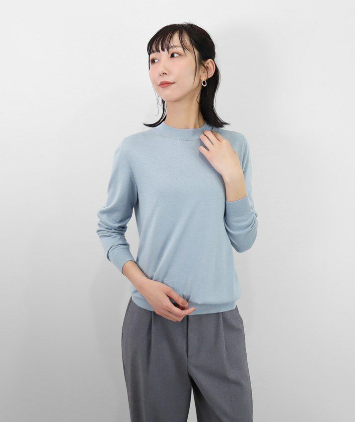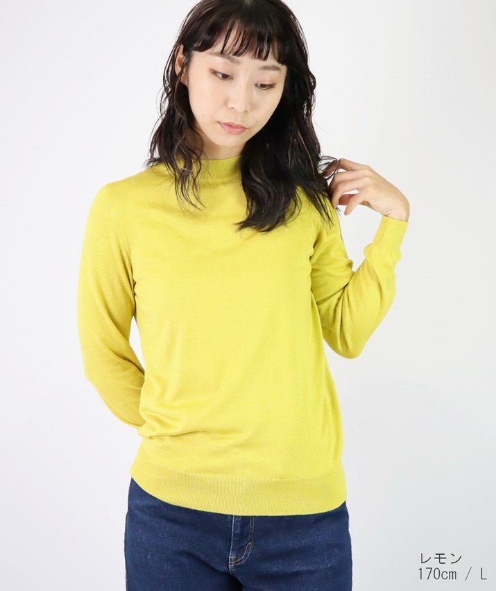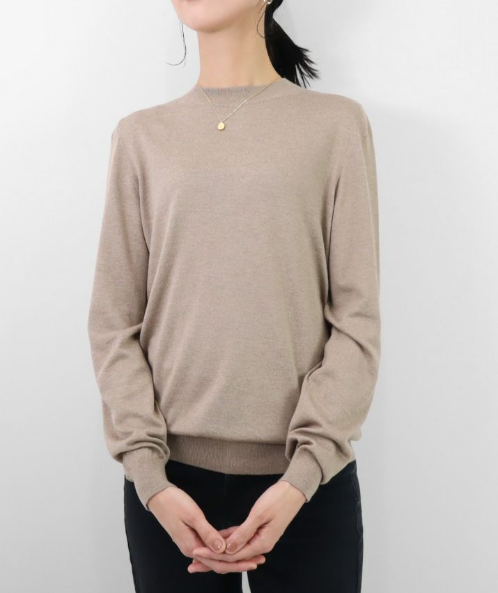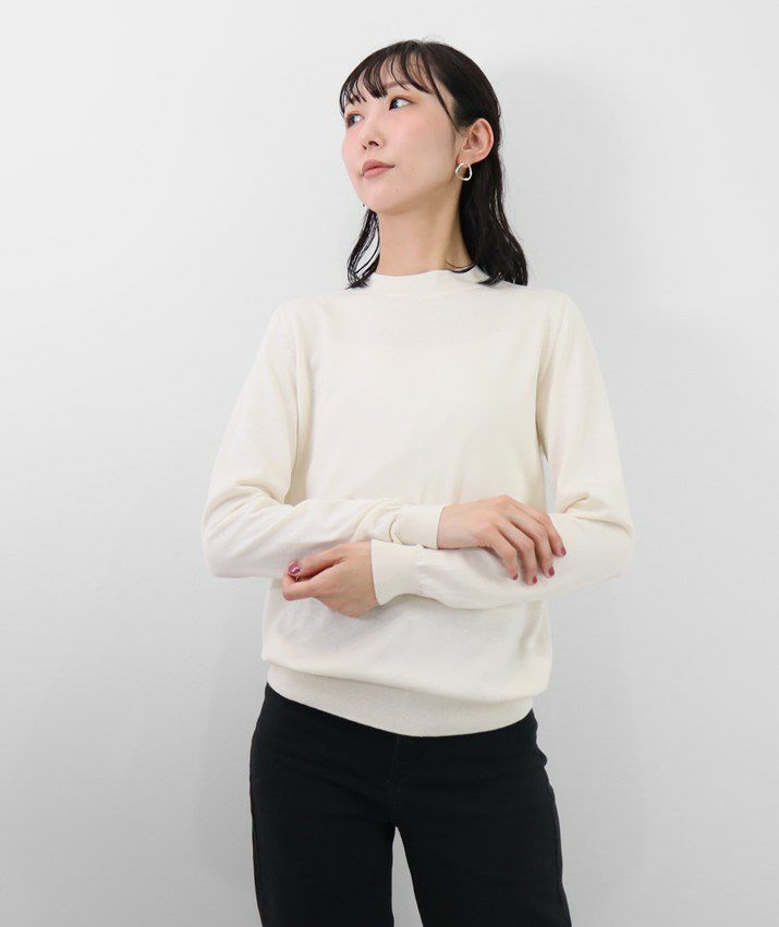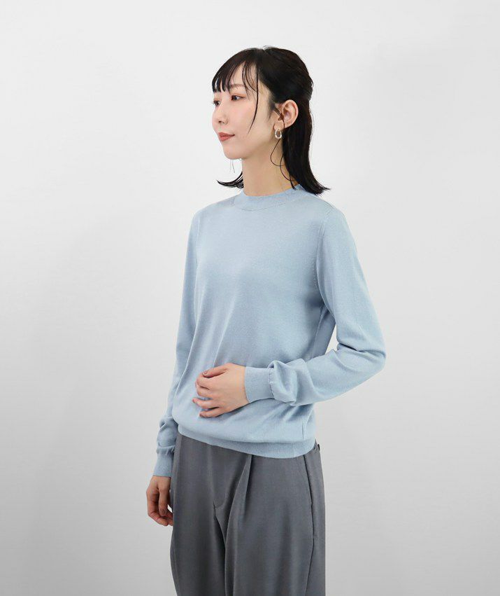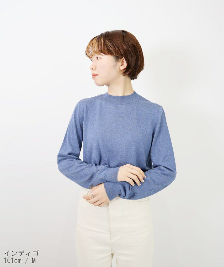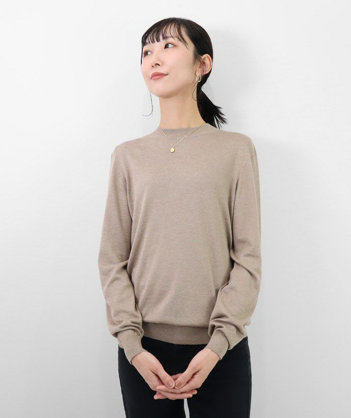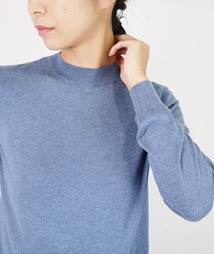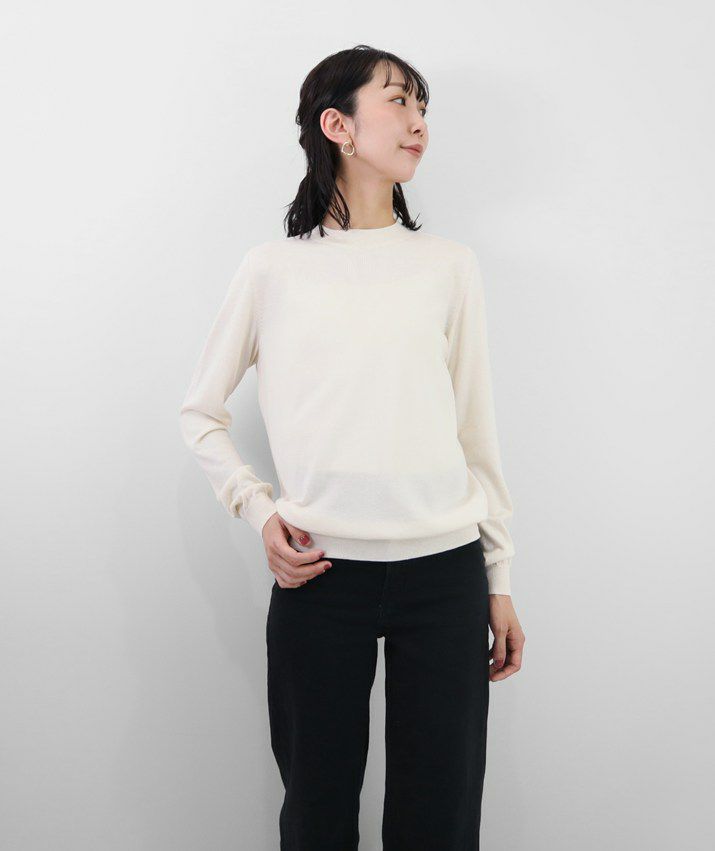 編地は16ゲージの天竺編みで、薄手で光沢感があり上品な印象に仕上げました。淡色はやや透け感があります。アクセサリーが映える上品なハイネックは、程よい高さで顔まわりをすっきり見せてくれます。とろみ感のある素材から生まれるドレープが女性らしい雰囲気の一枚です。