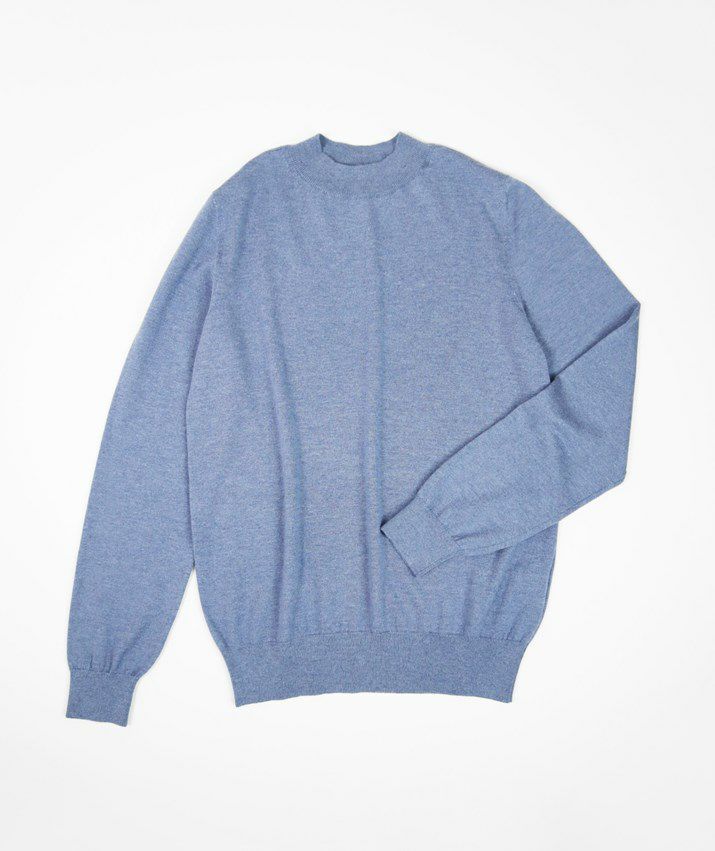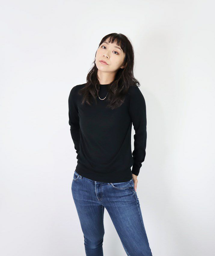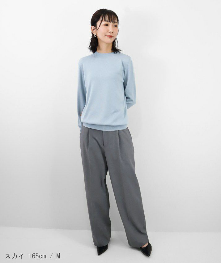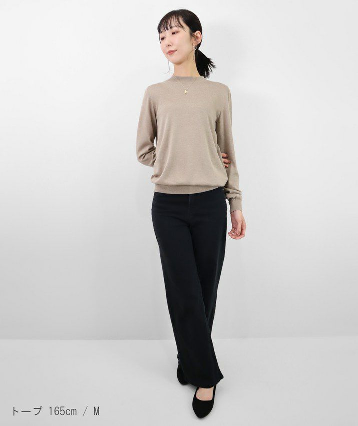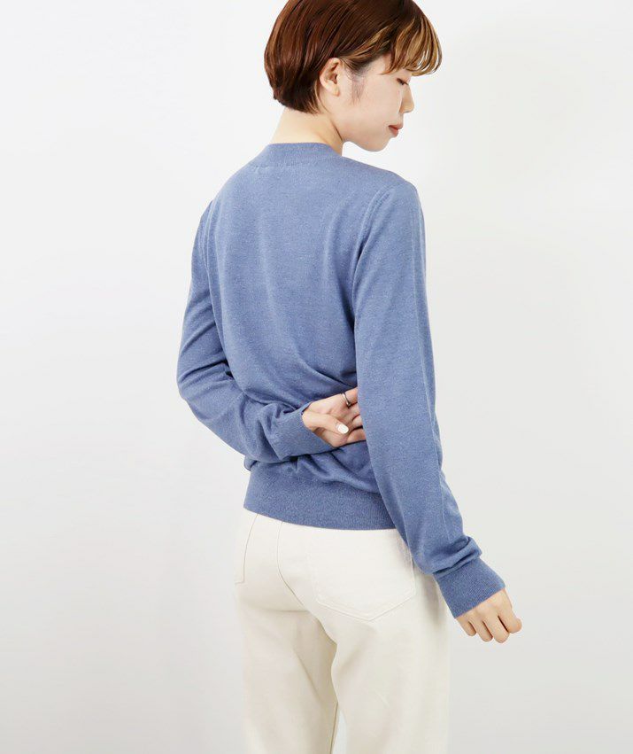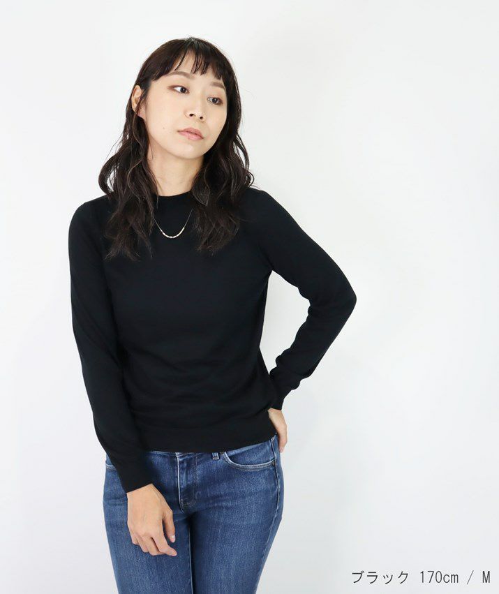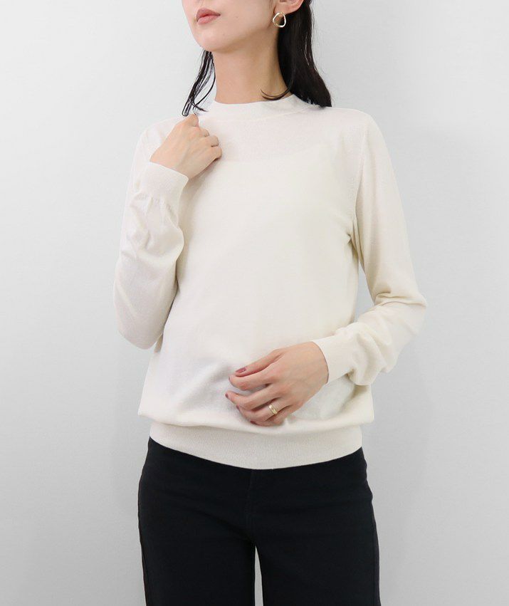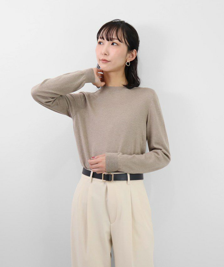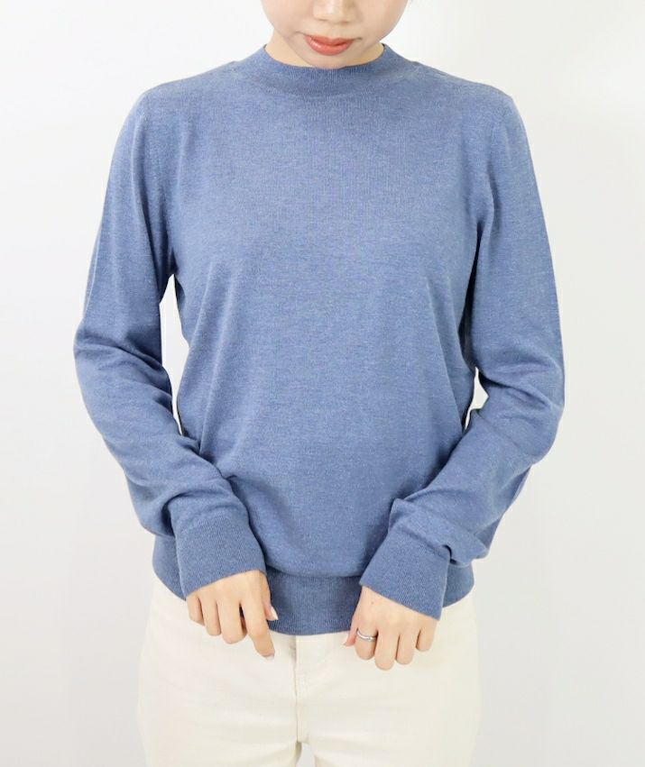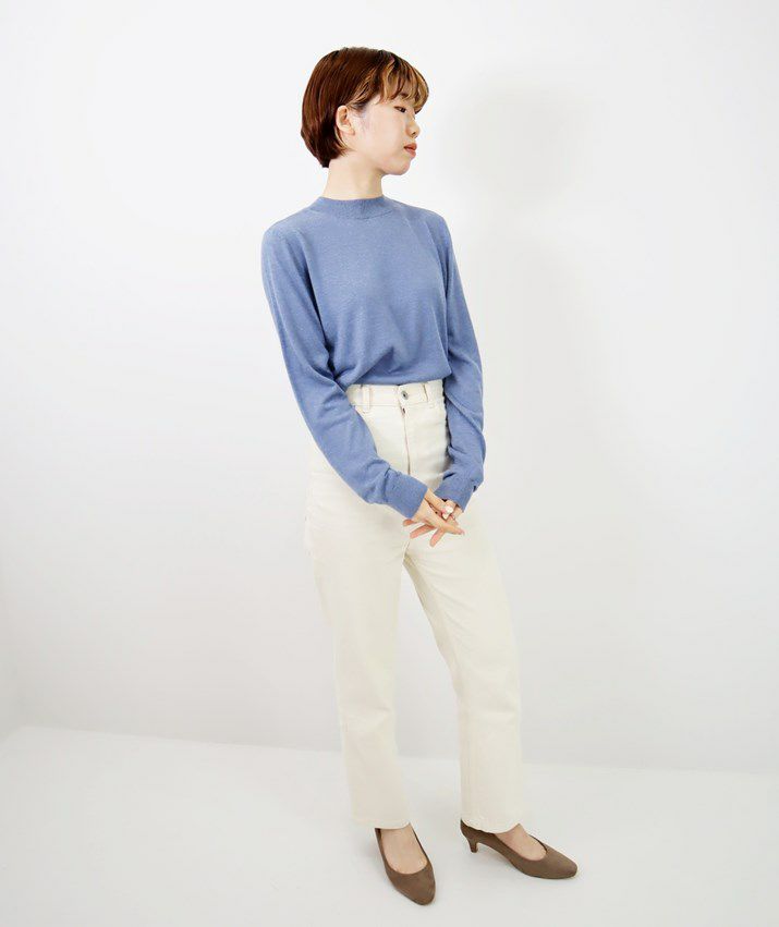 編地は16ゲージの天竺編みで、薄手で光沢感があり上品な印象に仕上げました。淡色はやや透け感があります。アクセサリーが映える上品なハイネックは、程よい高さで顔まわりをすっきり見せてくれます。とろみ感のある素材から生まれるドレープが女性らしい雰囲気の一枚です。