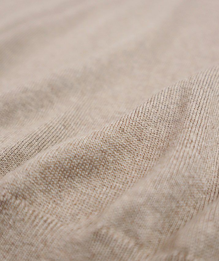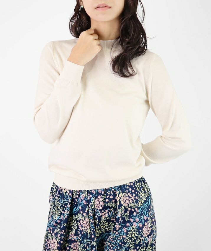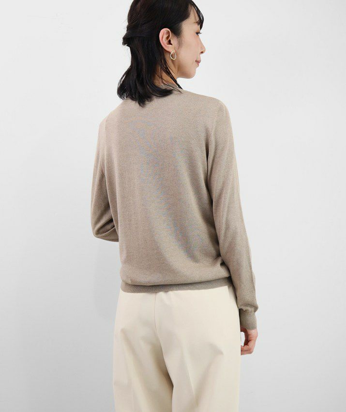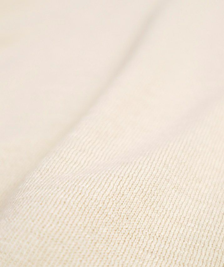 一般のシルクに比べ、繊維が細くしなやかなペニーシルクとカシミヤをブレンドした糸を使用。シルク混ならではの上品な光沢と、しっとりなめらかな肌触りが特長です。保湿性・保温性に優れ、秋から春までロングシーズン快適に着用できます。