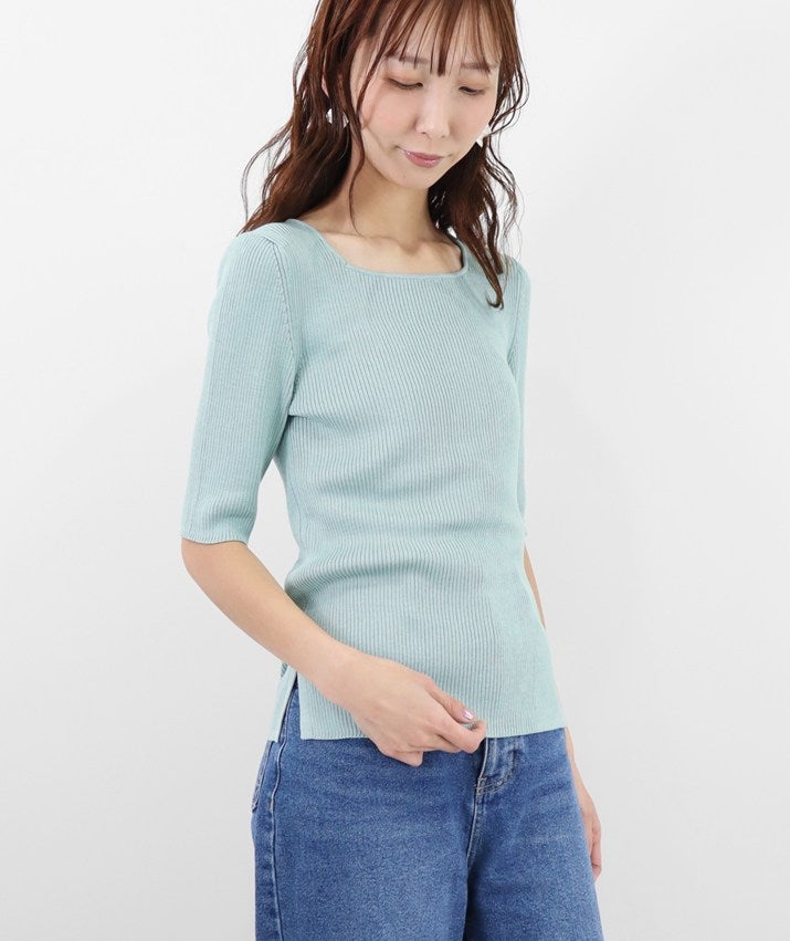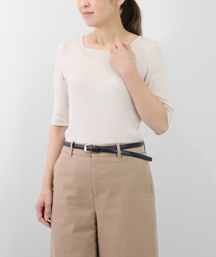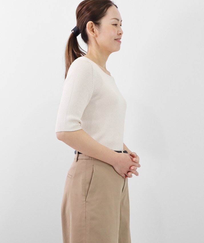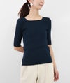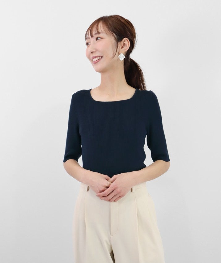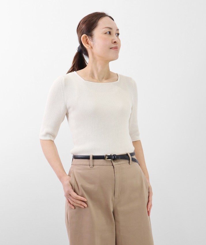 編地は14ゲージのリブ編み。糸を2本取りで使用することで程よい厚みと上品な光沢をプラス。伸縮性に優れ、締め付け感のないやわらかな着心地です。コンパクトですっきりとしたシルエットは、きちんと感のある印象を与え、オフィスカジュアルにも最適。深すぎないスクエアネックはデコルテをすっきり美しく見せ、五分袖は気になる二の腕をさりげなくカバーしてくれます。