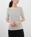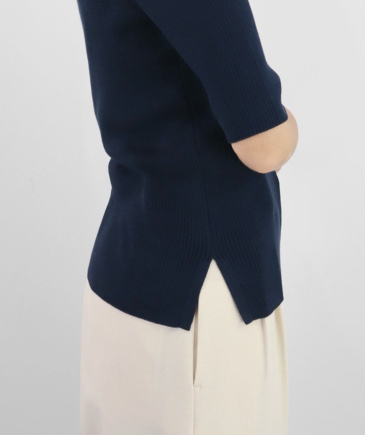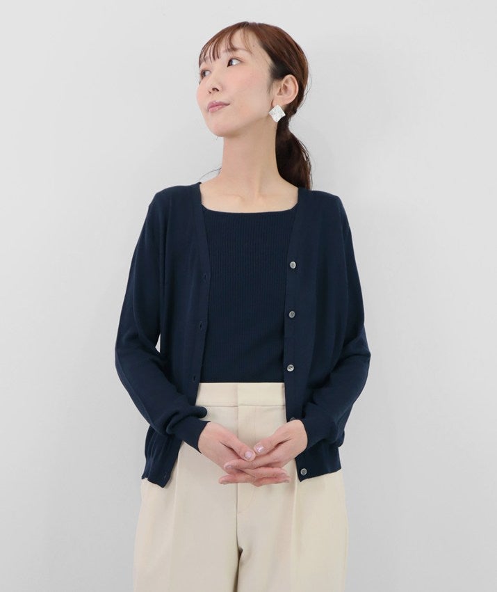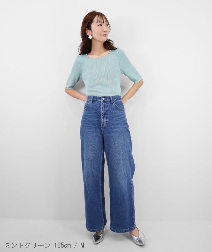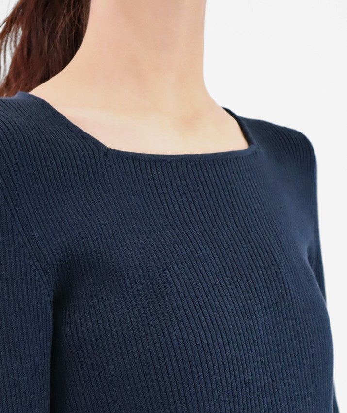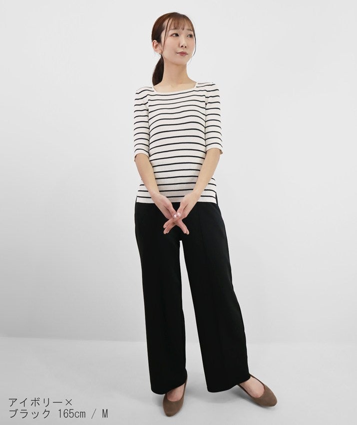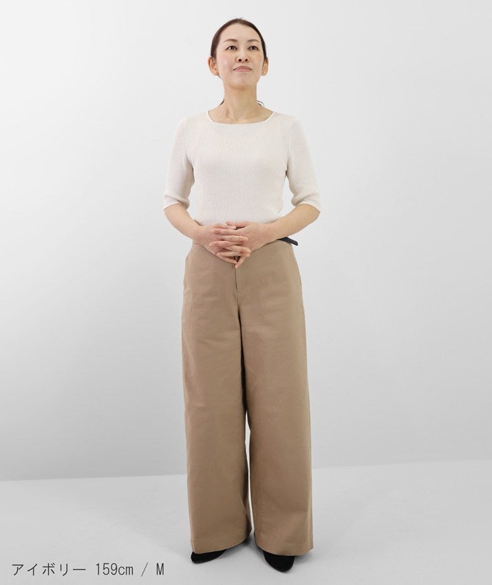 編地は14ゲージのリブ編み。糸を2本取りで使用することで程よい厚みと上品な光沢をプラス。伸縮性に優れ、締め付け感のないやわらかな着心地です。コンパクトですっきりとしたシルエットは、きちんと感のある印象を与え、オフィスカジュアルにも最適。深すぎないスクエアネックはデコルテをすっきり美しく見せ、五分袖は気になる二の腕をさりげなくカバーしてくれます。