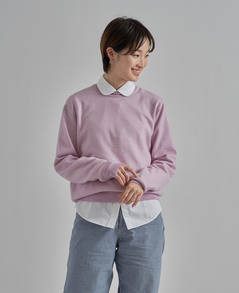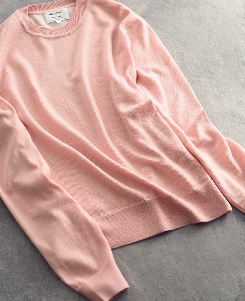 やや薄手に仕立てた、ウール100%のクルーネックセーター。