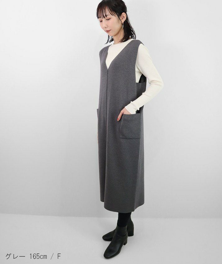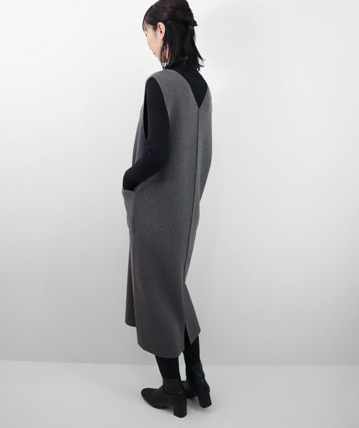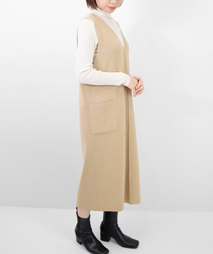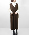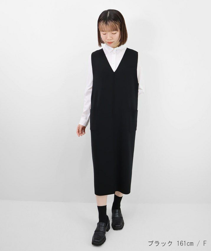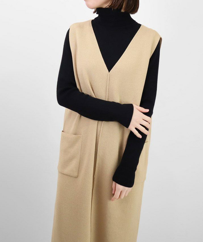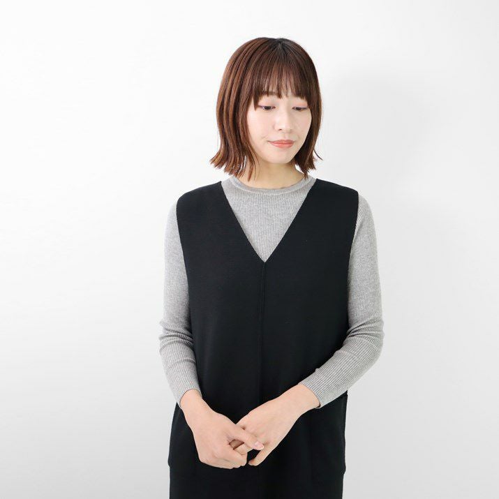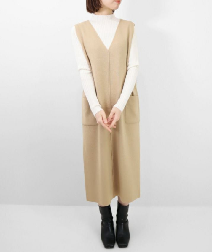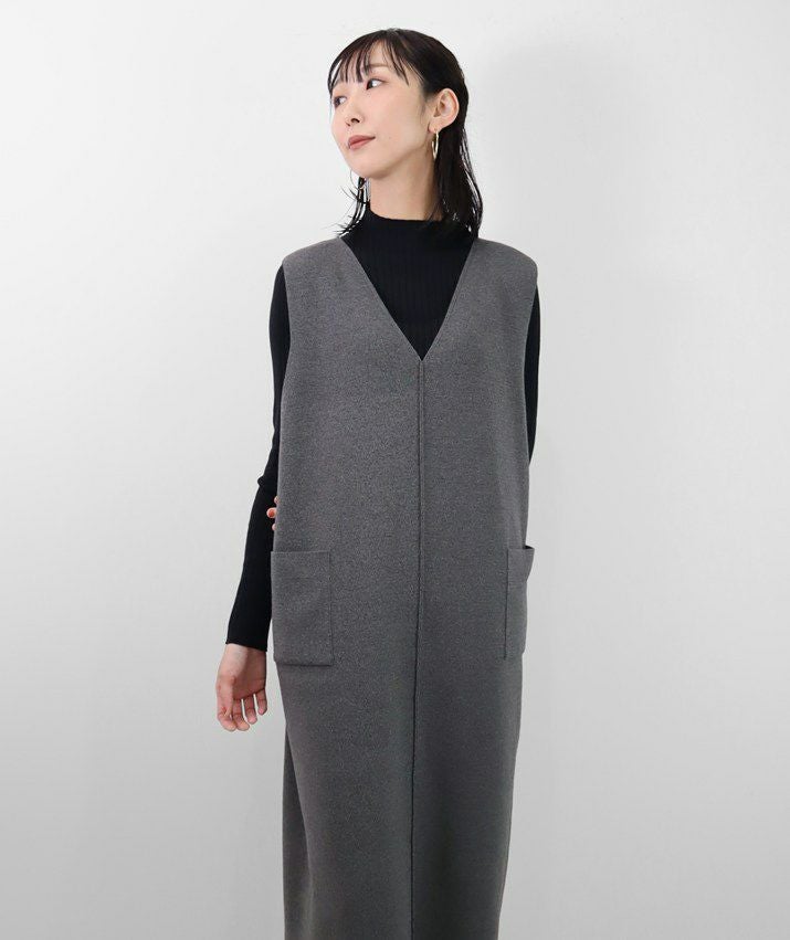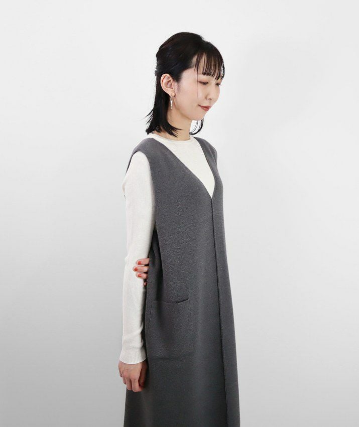 編地は14ゲージのミラノリブ。ハリのある編地で上品な印象に仕上げました。Iラインのすっきりとしたシルエットで、ジャンパースカートでも幼く見えず大人っぽく着ていただけます。裾にはスリット入り。ゆとりのあるつくりで体のラインを拾いにくいのも嬉しいポイント。パッチポケット付。