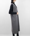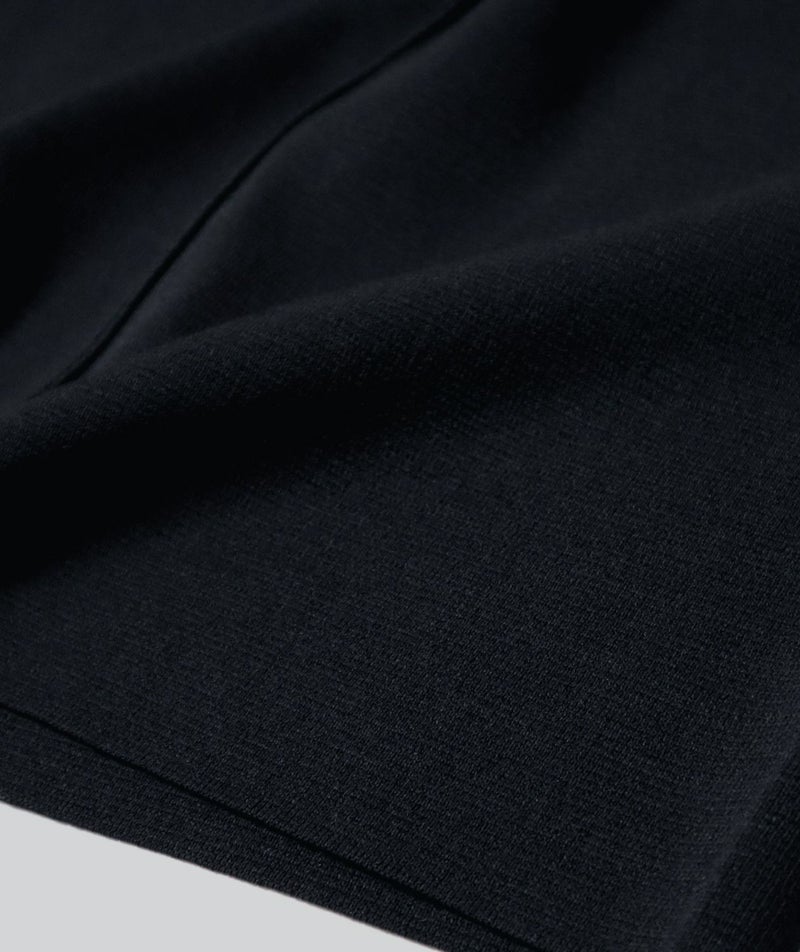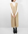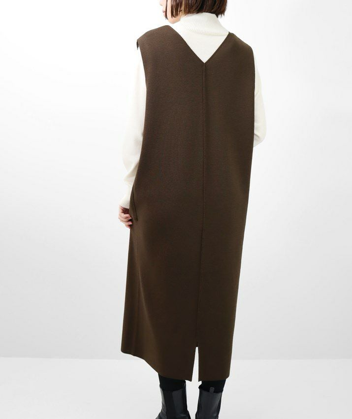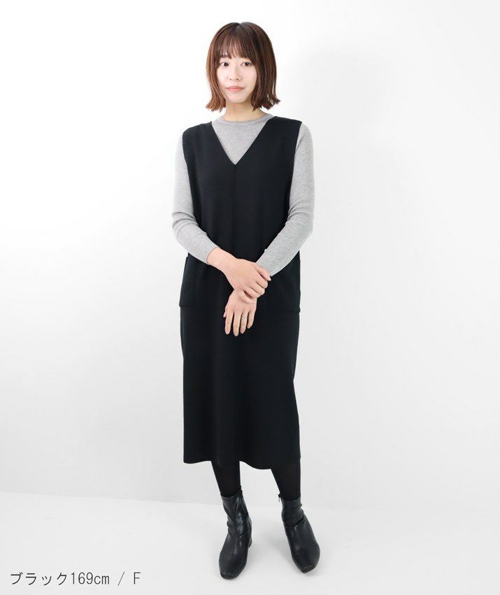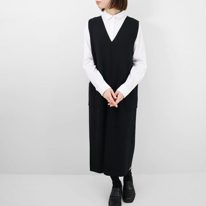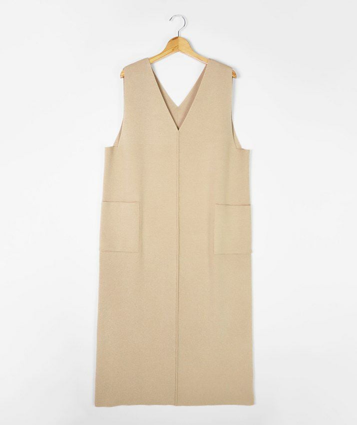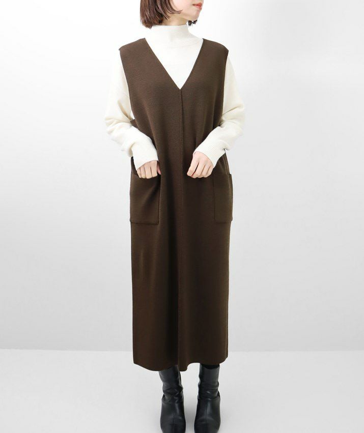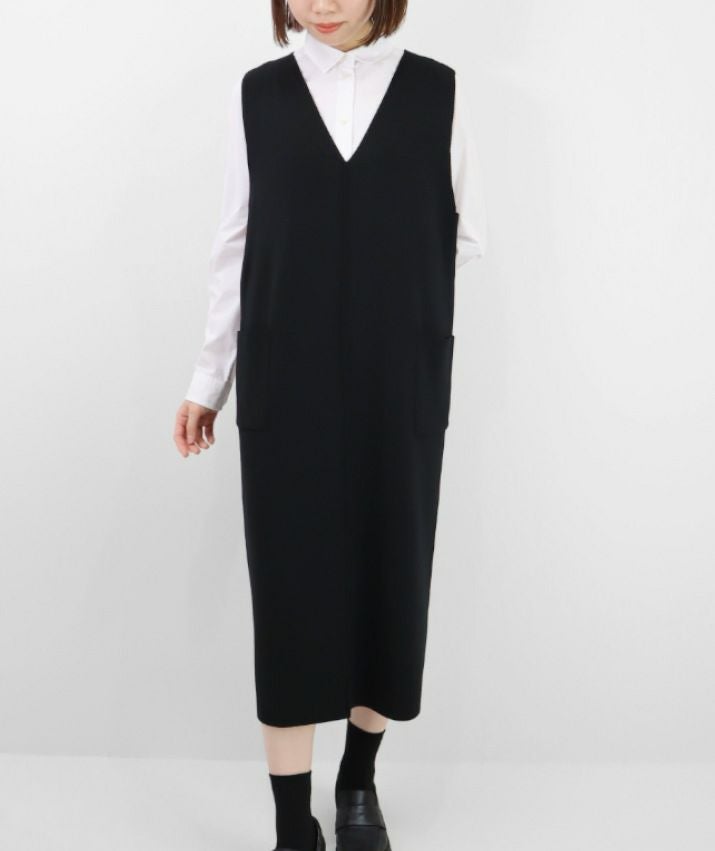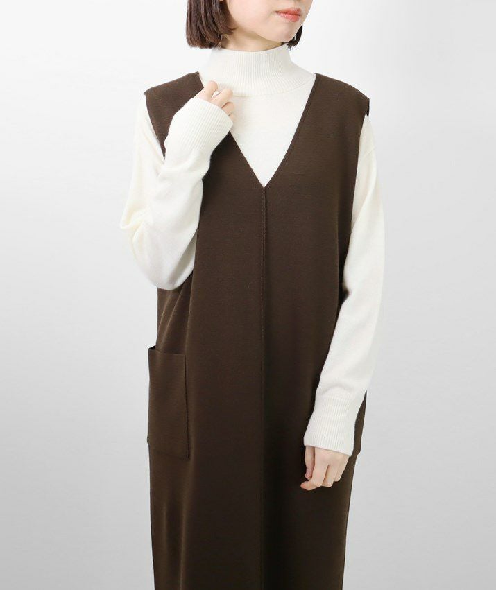 編地は14ゲージのミラノリブ。ハリのある編地で上品な印象に仕上げました。Iラインのすっきりとしたシルエットで、ジャンパースカートでも幼く見えず大人っぽく着ていただけます。裾にはスリット入り。ゆとりのあるつくりで体のラインを拾いにくいのも嬉しいポイント。パッチポケット付。