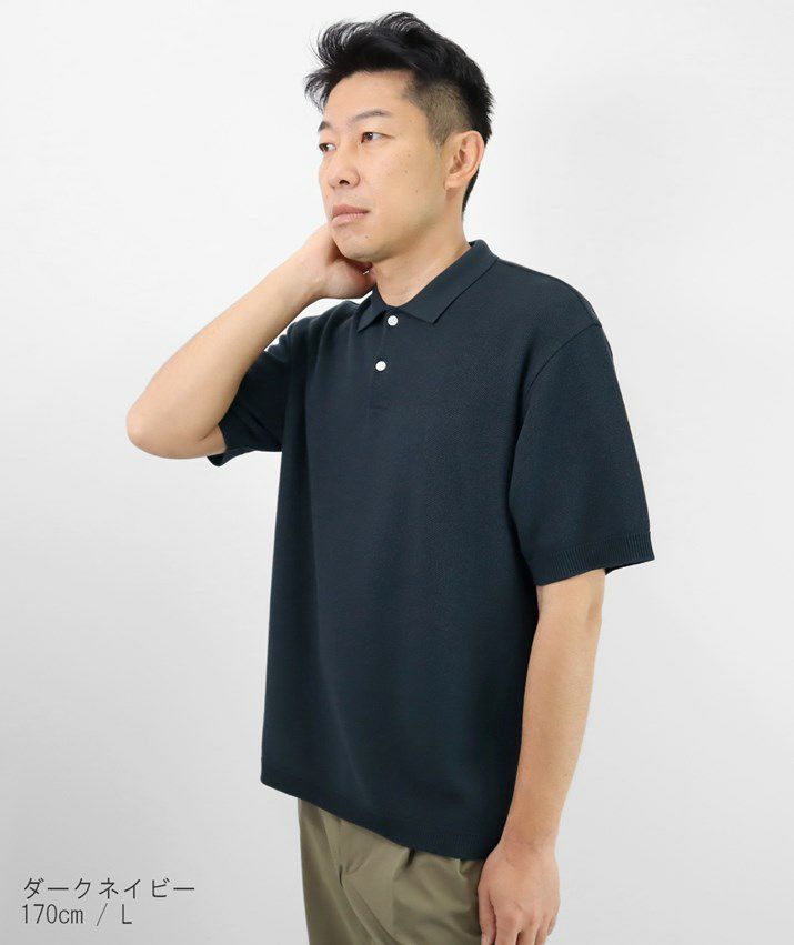 編地は14ゲージのハニカム柄編み。肌との接地面が少なく通気性に優れています。ややゆったりめのシルエットで、リラックス感のある着心地。シンプルなデザインの中に、裾や袖口のリブ組織がアクセントになっています。衿はリンキングづけ、前立ては総針で、ニットらしいディテールにもこだわりました。