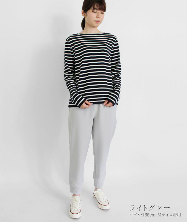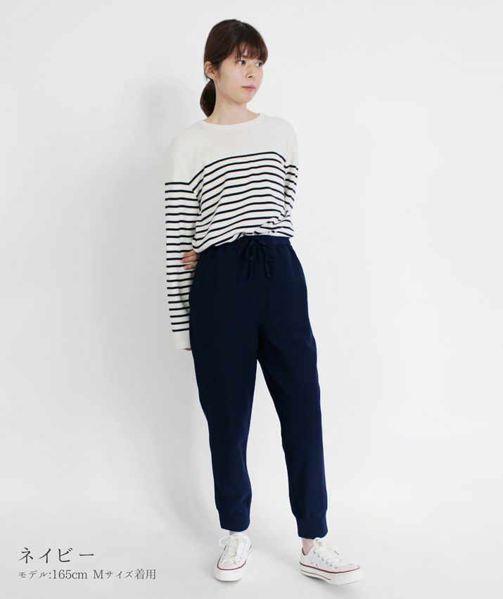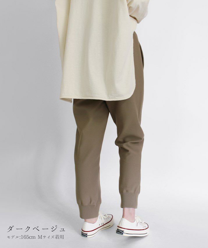 ・裾に向かって細くなっていくテーパードシルエットと、裾リブの引き締め効果ですっきり見えます