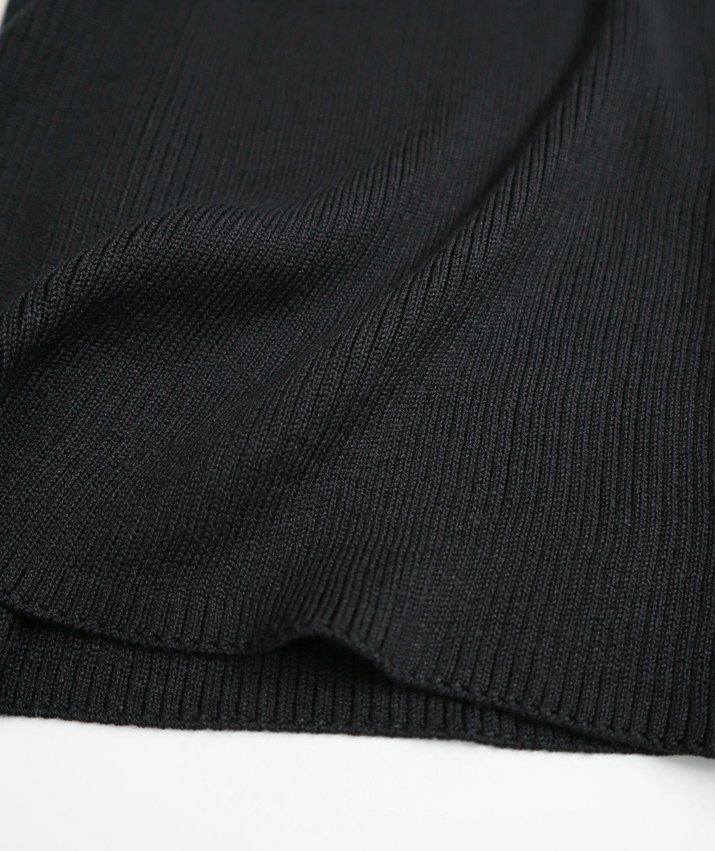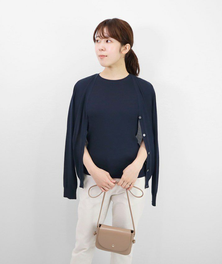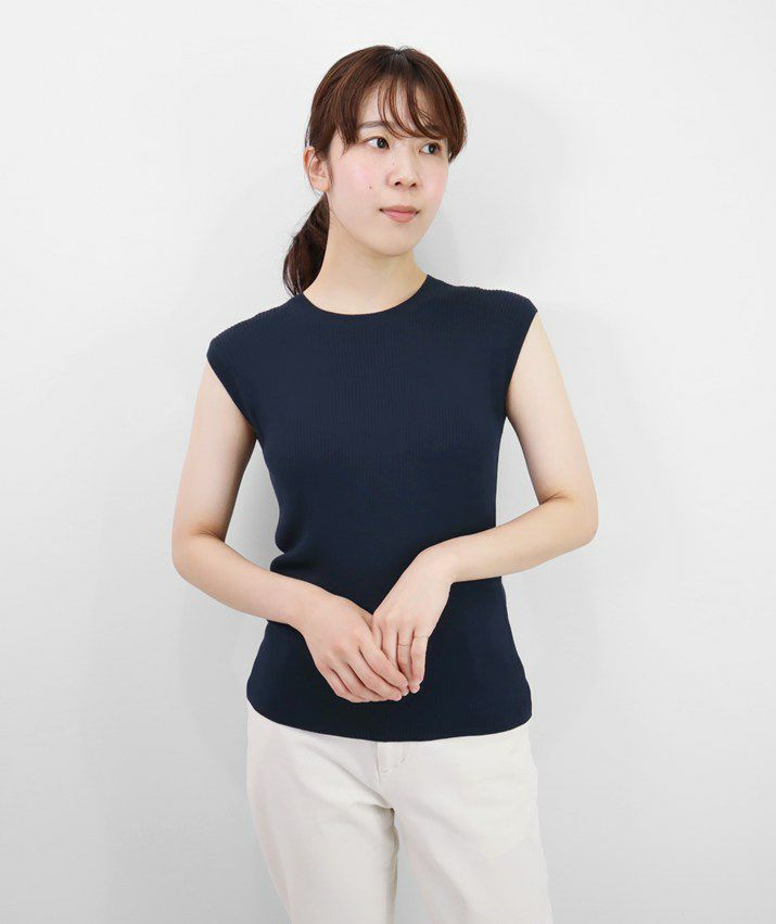 編地は14ゲージのリブ編み。糸を2本取りで使用することで程よい厚みと上品な光沢をプラス。コンパクトなシルエットですが伸縮性があり、締め付け感のないやわらかな着心地。ほどよく肩にかかる絶妙な袖丈で、ノースリーブに抵抗がある大人世代にも取り入れやすい1枚です。