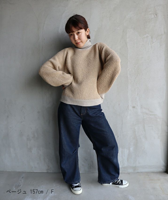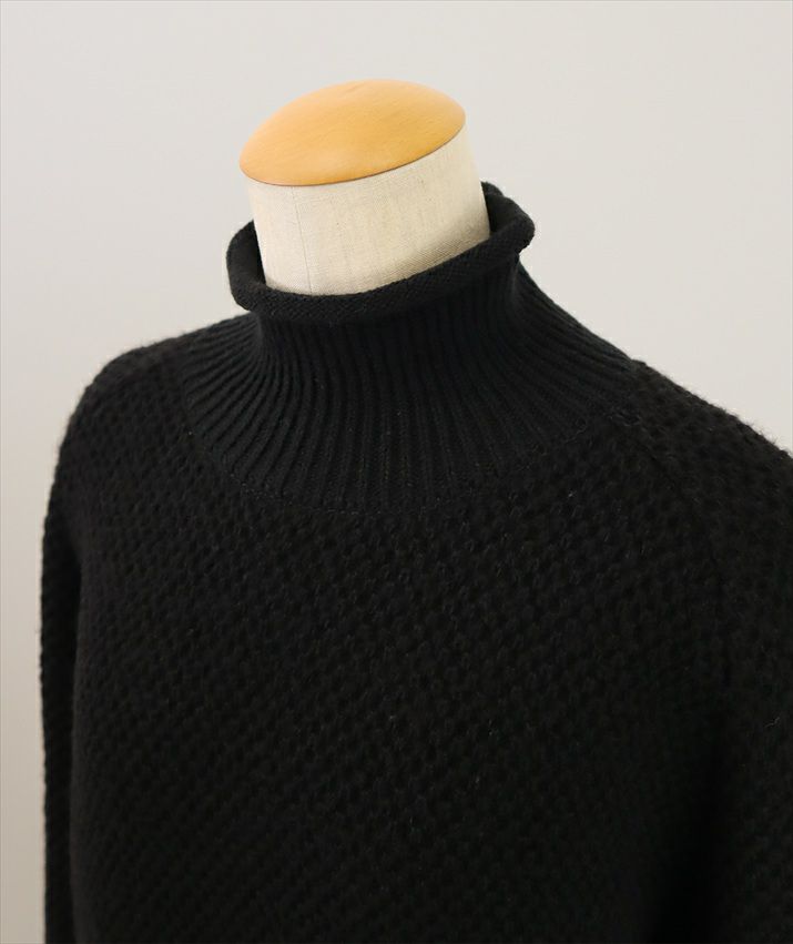 ラグランスリーブのやわらかな曲線と、衿ぐりのくるくると巻かれた部分が柔らかい雰囲気の丸みを帯びたシルエットを作ります。