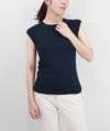 編地は14ゲージのリブ編み。糸を2本取りで使用することで程よい厚みと上品な光沢をプラス。コンパクトなシルエットですが伸縮性があり、締め付け感のないやわらかな着心地。ほどよく肩にかかる絶妙な袖丈で、ノースリーブに抵抗がある大人世代にも取り入れやすい1枚です。