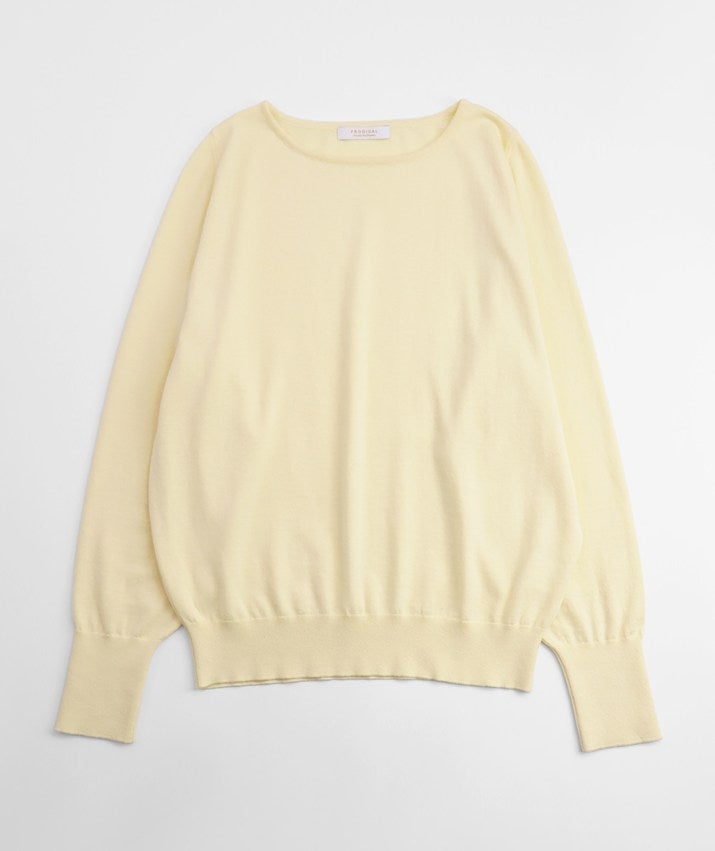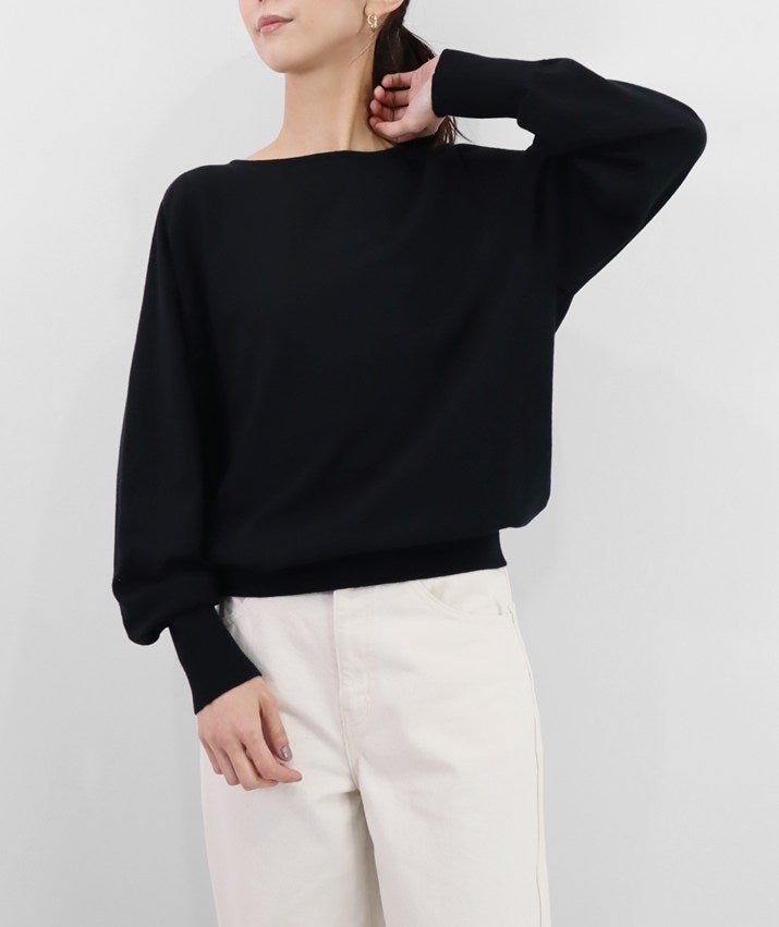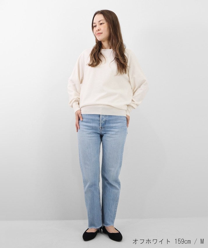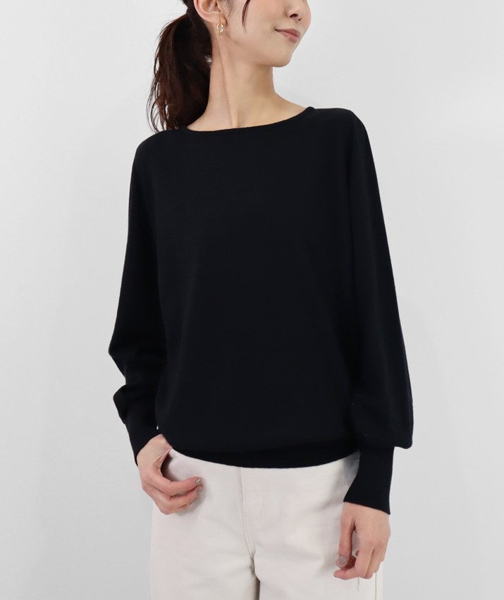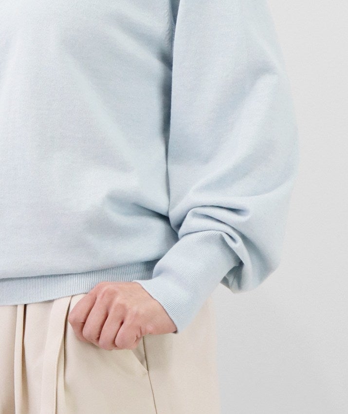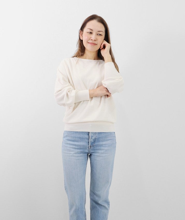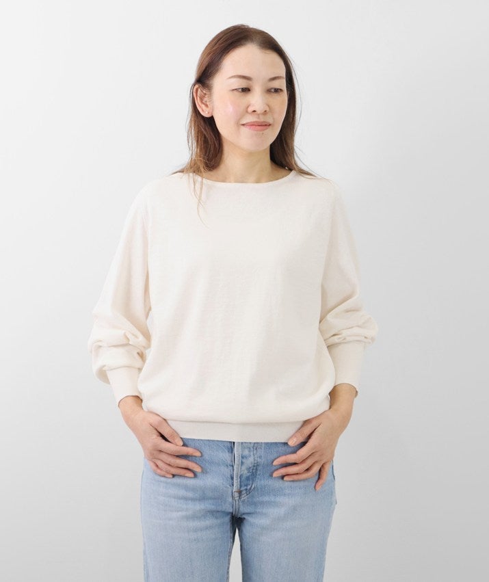 16ゲージの天竺編みで、編み目の目立たないプレーンな表情に。程よい丸みとボリュームをもたせた袖が、さりげなくフェミニンな印象を演出します。長めに設定した裾と袖口のリブが、スタイリングにほどよいアクセントをプラス。