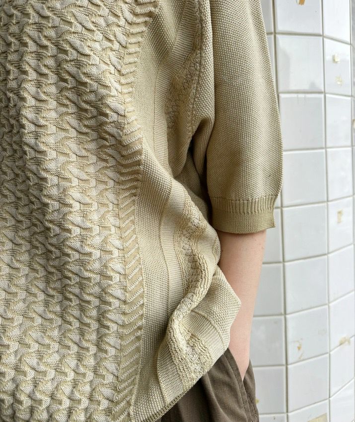 トロンプルイユのような視覚的な立体感を加えたニットらしいテキスタイルとなりました。