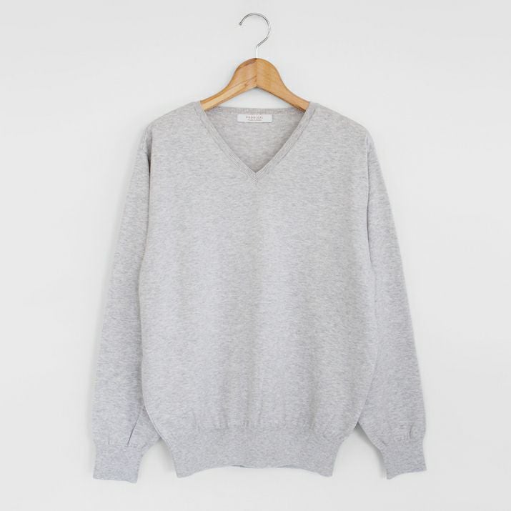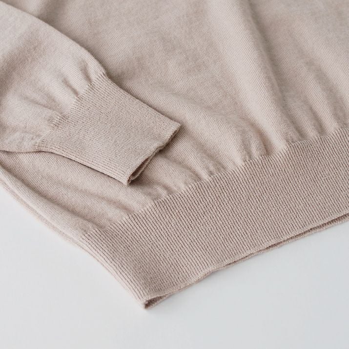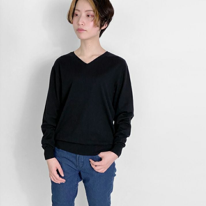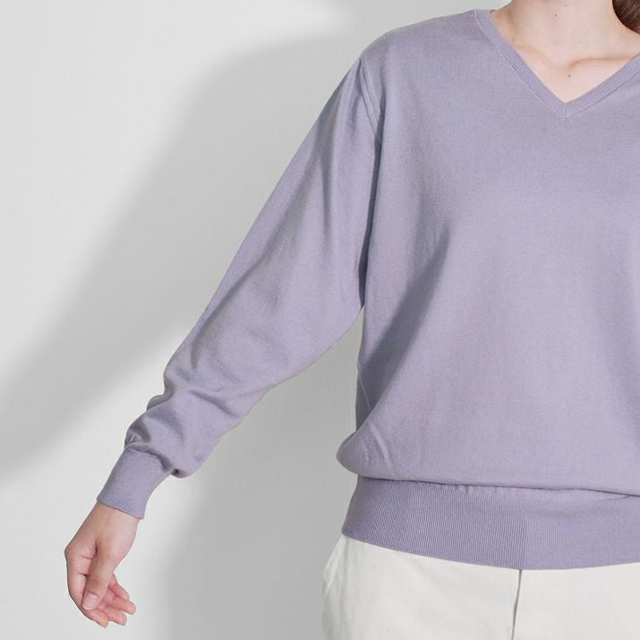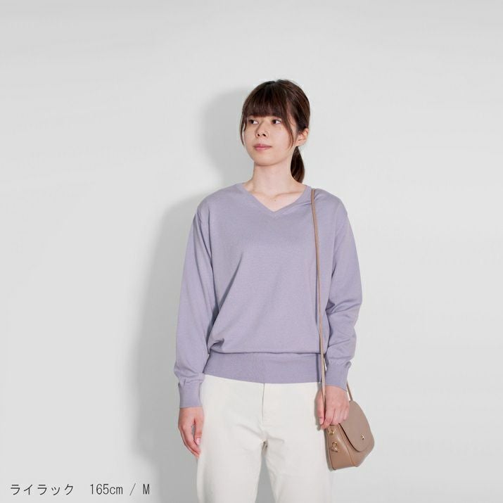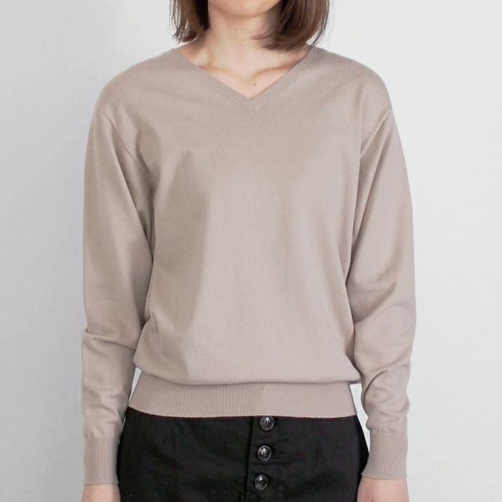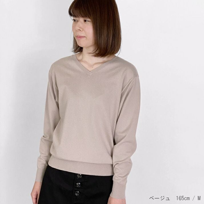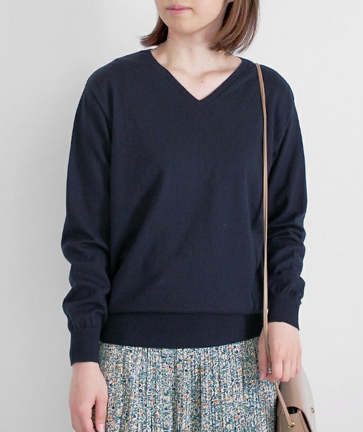 16ゲージの天竺編みで、編み目の目立たないプレーンな表情に仕上げ、上品な印象に。シンプルで飽きのこないベーシックなVネックデザイン。すっきりと開いたVネックがデコルテをきれいに見せ、抜け感のあるスタイルに。薄手でさらっと着られるので、あたたかい季節は一枚で、肌寒い日には羽織りもののインナーとしても◎シーズンレスで活躍する万能な一枚です。