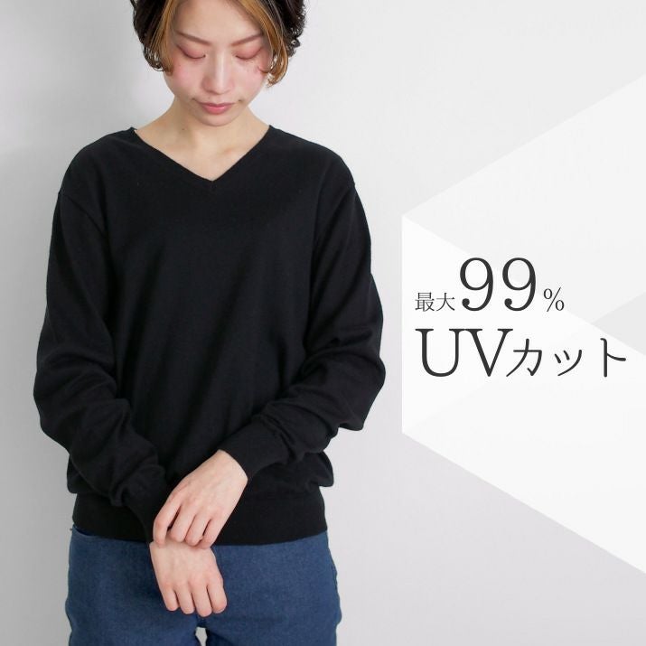 しなやかなカシミヤとなめらかな超長綿をブレンドしたコットンカシミヤ素材を使用。ふんわりやわらかな風合いと軽やかな着心地が魅力です。自宅で手洗いできるので、お手入れも簡単。さらに、最大99%*の紫外線をカットするUVカット機能付きで、日差しの気になる季節にも心強い一枚です。(*紫外線を最も遮るといわれているブラックでの試験結果)