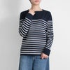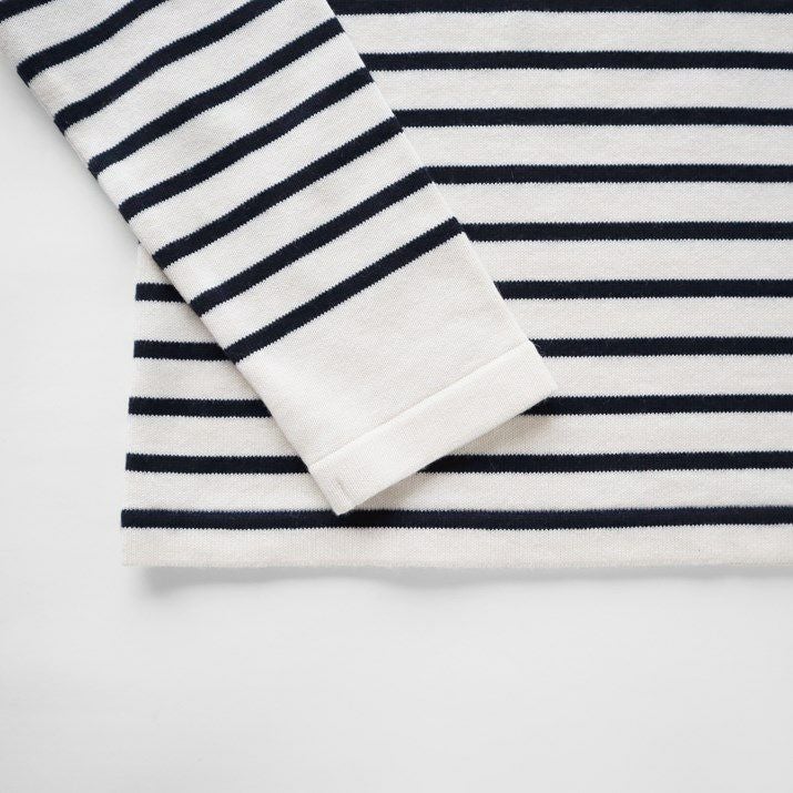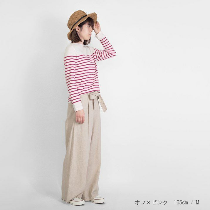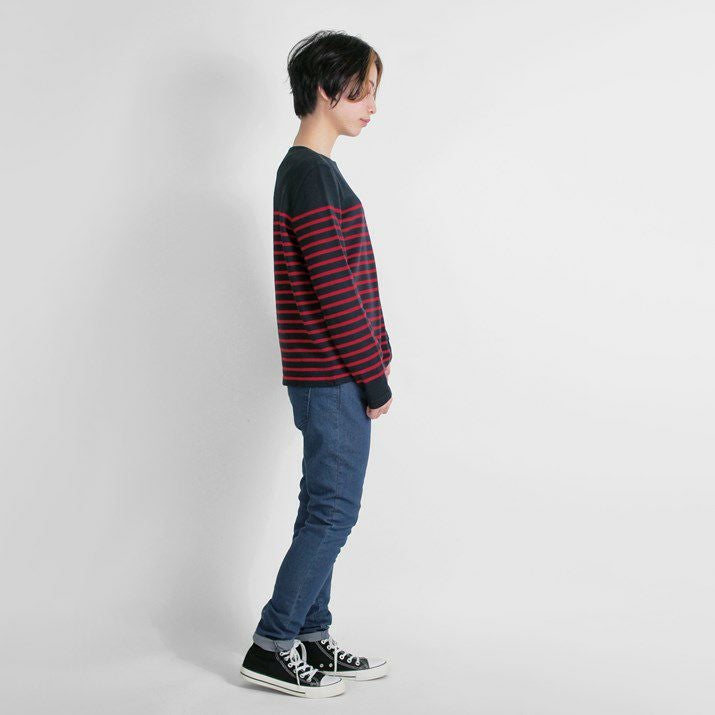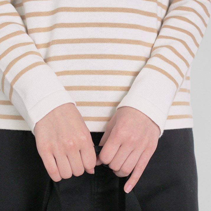 パネルボーダーをあしらった12ゲージ天竺編みのプルオーバー。シルエットと配色のバランスにこだわり、大人っぽく上品な印象に仕上げました。ボーダーの幅や配置を計算することで、すっきり見えつつも程よくカジュアルな雰囲気に。シンプルながら存在感があり、一枚で着てもサマになるデザインです。