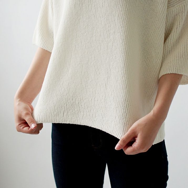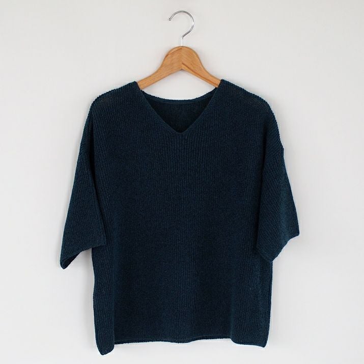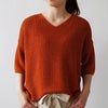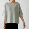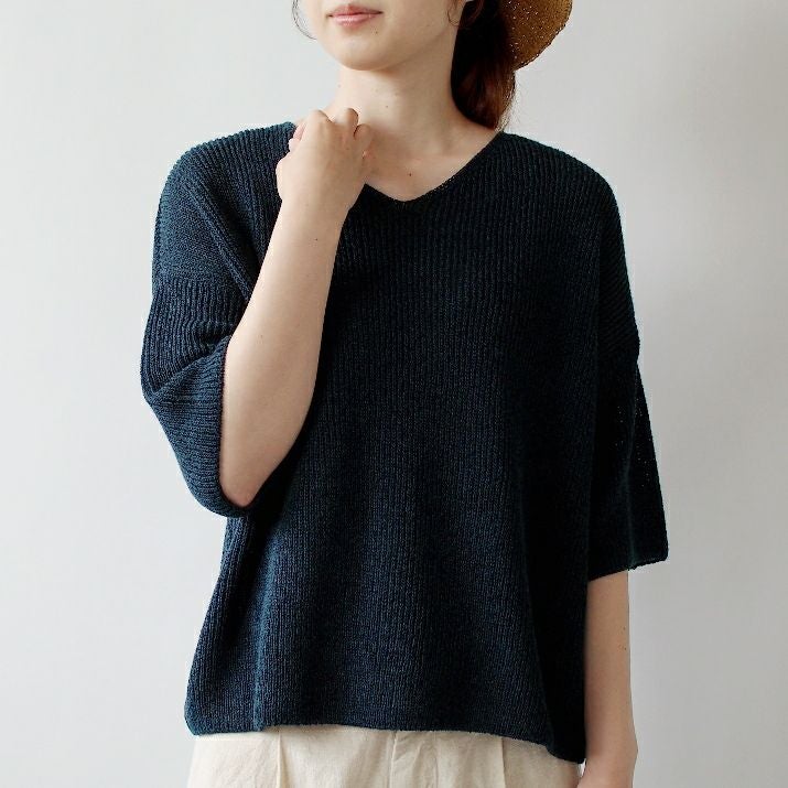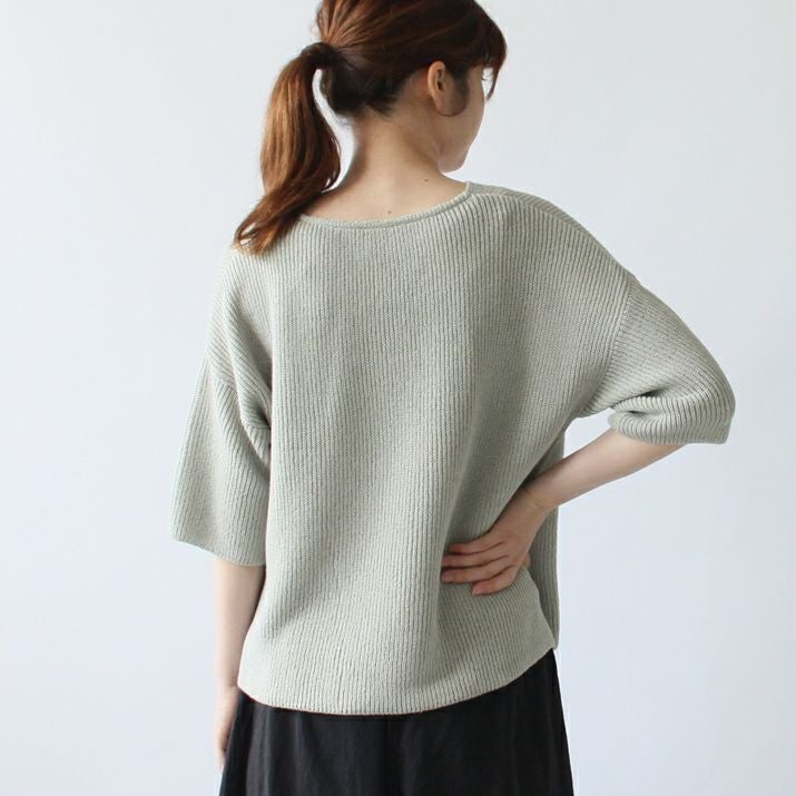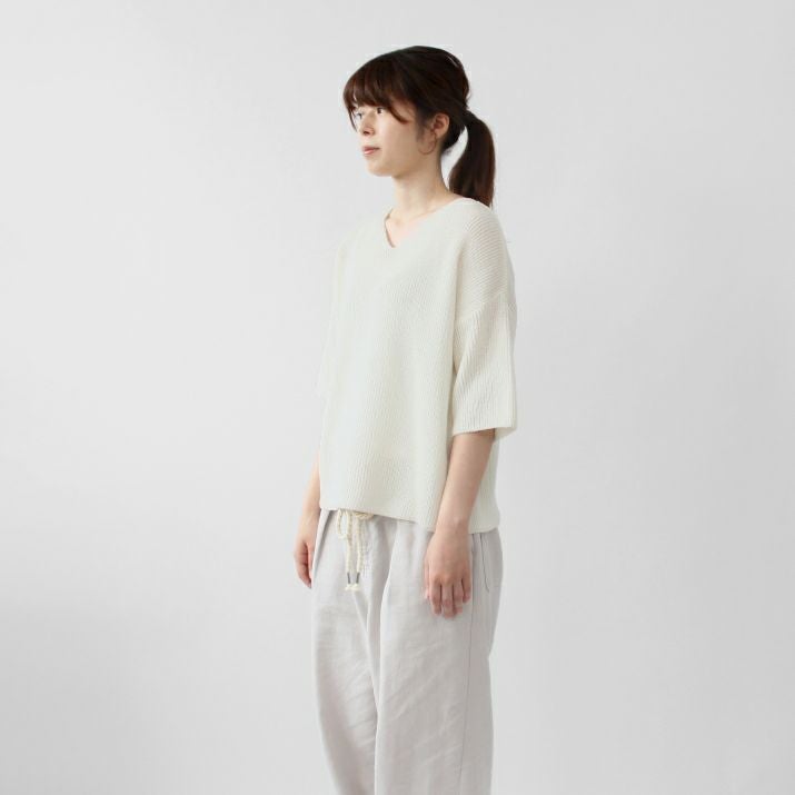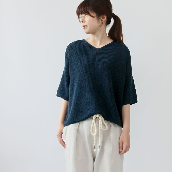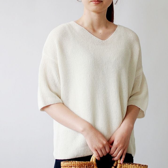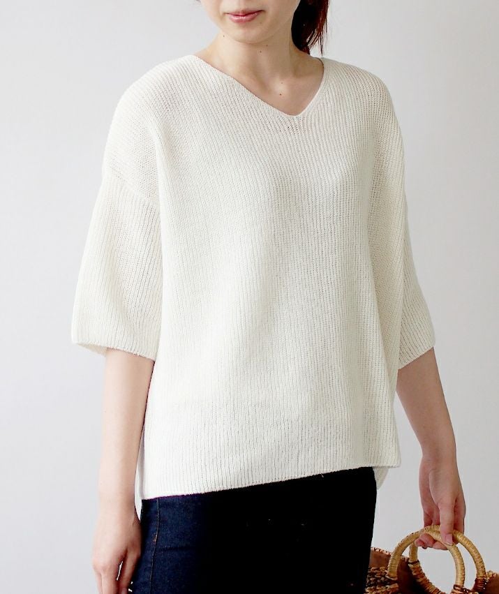 通気性の良いざっくりした7ゲージの片畦編み。編地の凹凸により肌との接地面が少なくなるから涼しく着られて、汗をかいてもはりつきません。Vネックや裾は成型編みですっきりと仕上げ、ほどよい衿ぐりの開きがデコルテをきれいに見せてくれます。肩を落としたオーバーサイズのゆったりシルエットで、リラックスした着心地が魅力です。長めの袖丈だから、真夏はもちろん季節の変わり目にも活躍します。