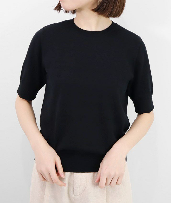 Tシャツのように気軽に着られる、さらりとした肌触りのサマーニット。編地は14ゲージの天竺編み。しなやかで細かく均一な編み目が上品な印象を与えます。シルク混ならではのやさしい光沢感で、カジュアルになりすぎず、きれいめなスタイルに仕上がります。衿ぐり・袖口・裾はリブ仕様で、すっきりとしたシルエットに。シンプルで洗練されたデザインだから、流行に左右されず長くご愛用いただけます。
