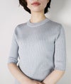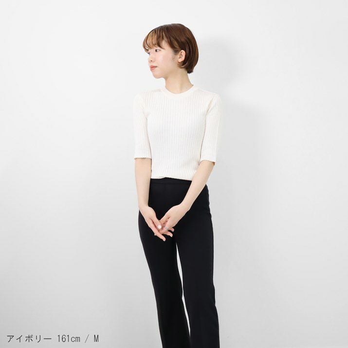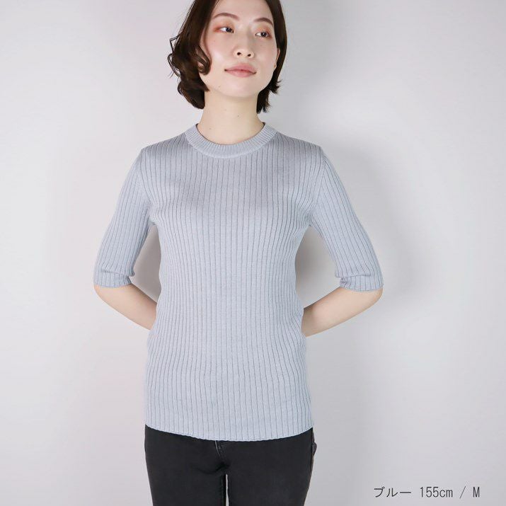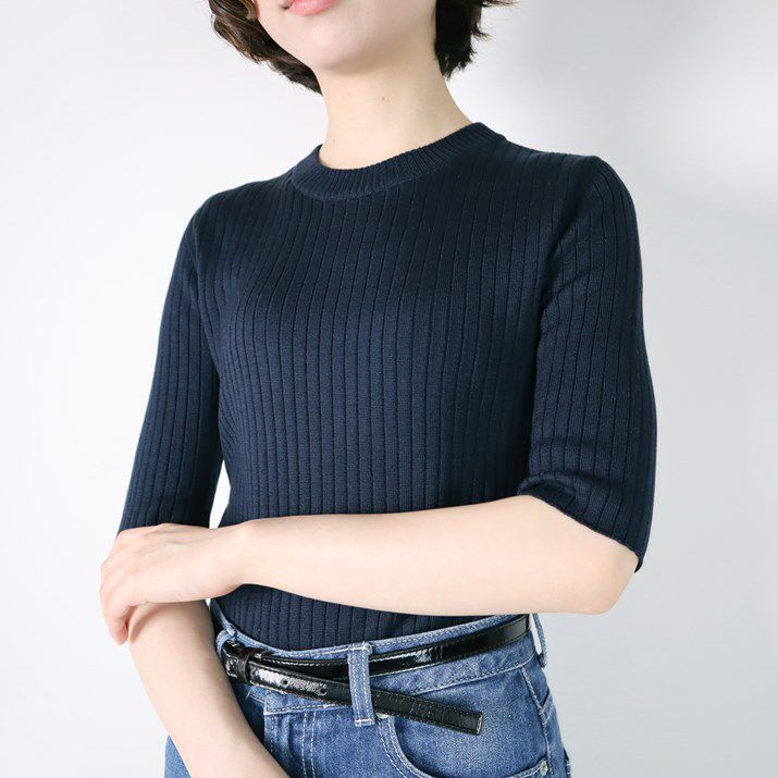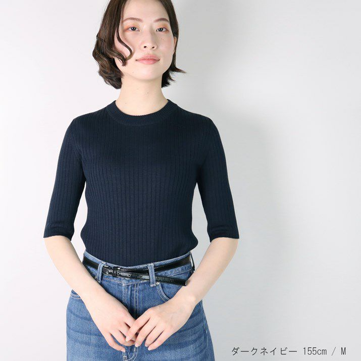 編地は14ゲージのリブ編み。糸を2本取りで使用することでほどよい厚みと上品な光沢が生まれます。ほどよく幅のあるワイドリブがコーディネートのアクセントに。気になる二の腕をカバーしつつ、すっきり見せてくれる五分袖もポイント。Tシャツのように気軽に着られるのに、ほどよくきちんと感をプラスしてくれます。