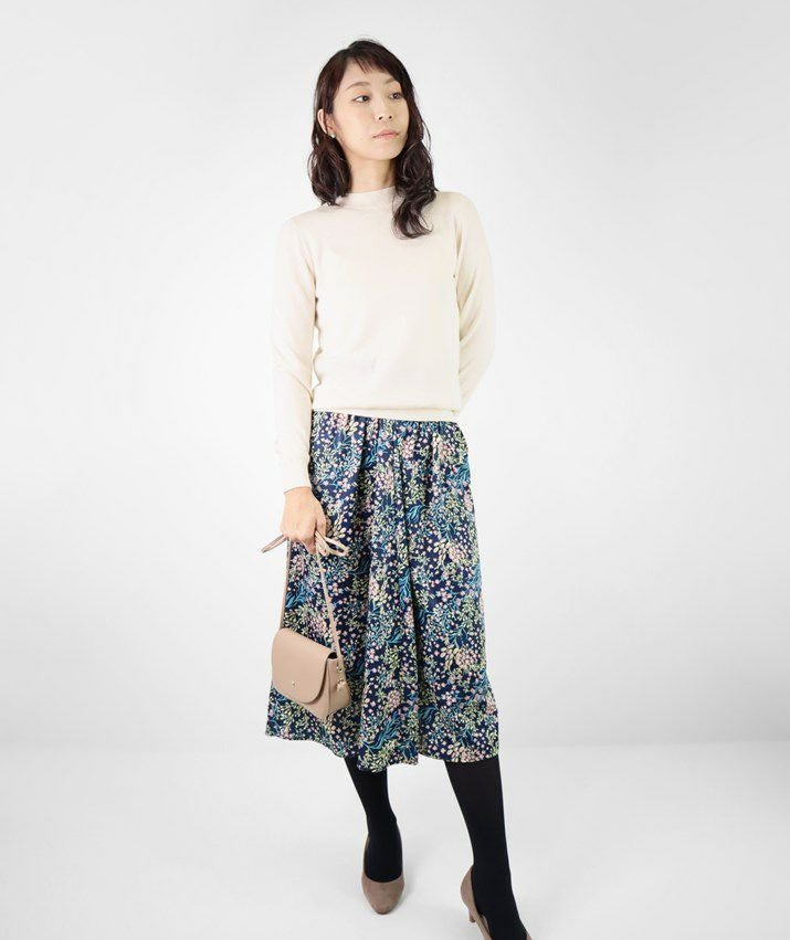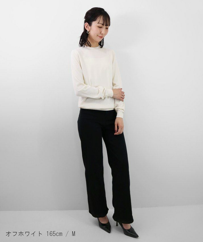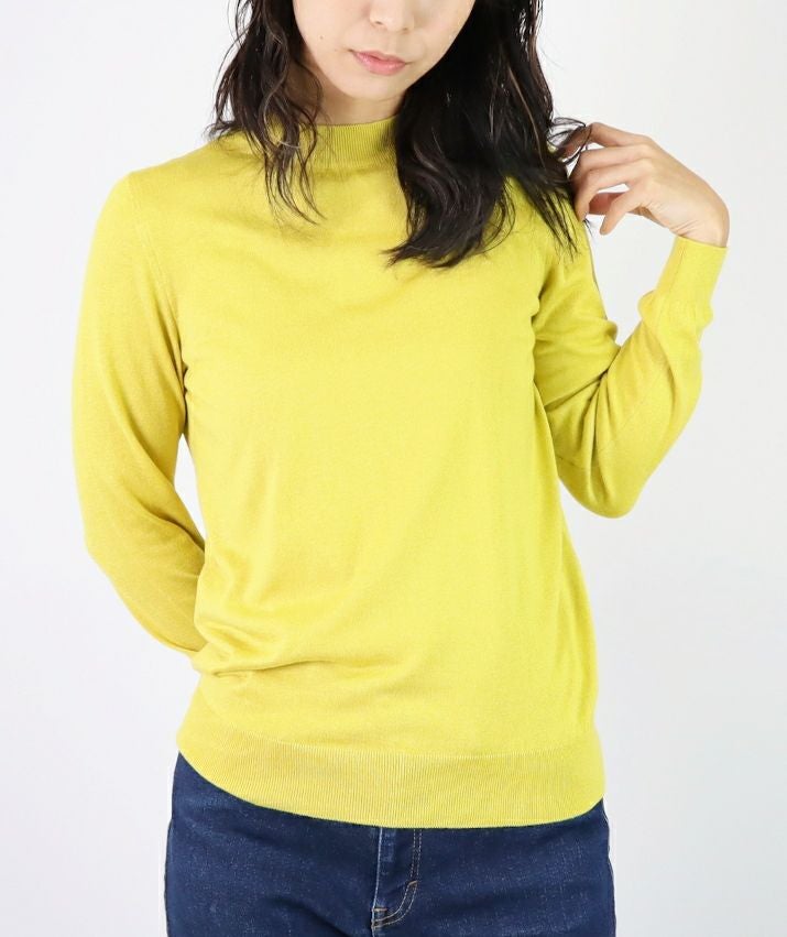 編地は16ゲージの天竺編みで、薄手で光沢感があり上品な印象に仕上げました。淡色はやや透け感があります。アクセサリーが映える上品なハイネックは、程よい高さで顔まわりをすっきり見せてくれます。とろみ感のある素材から生まれるドレープが女性らしい雰囲気の一枚です。