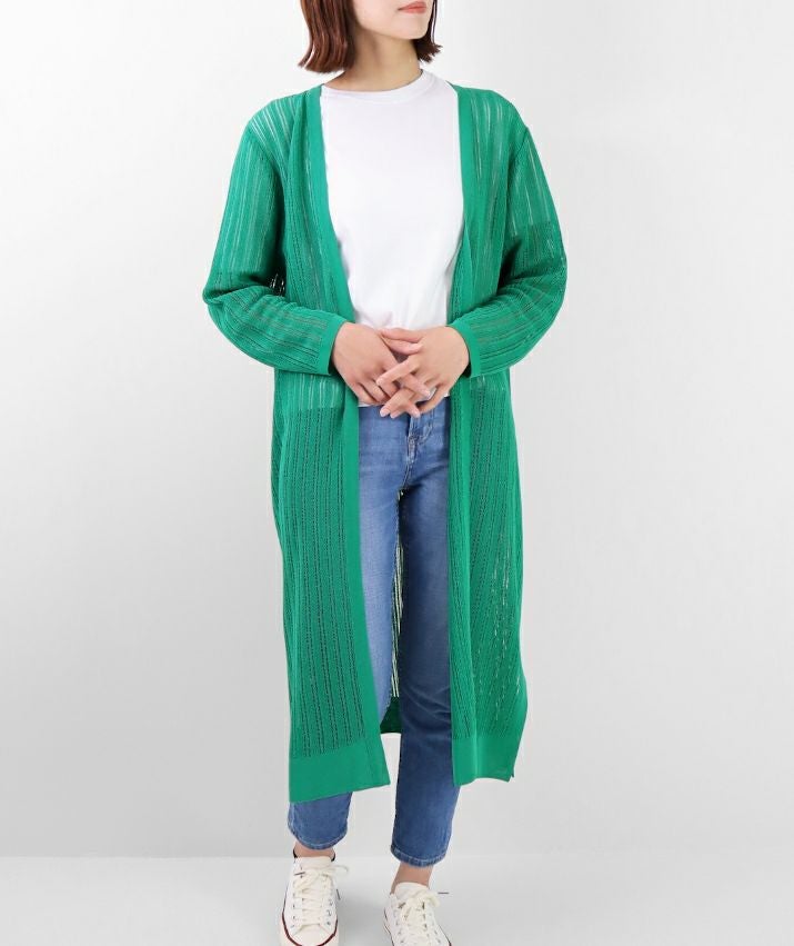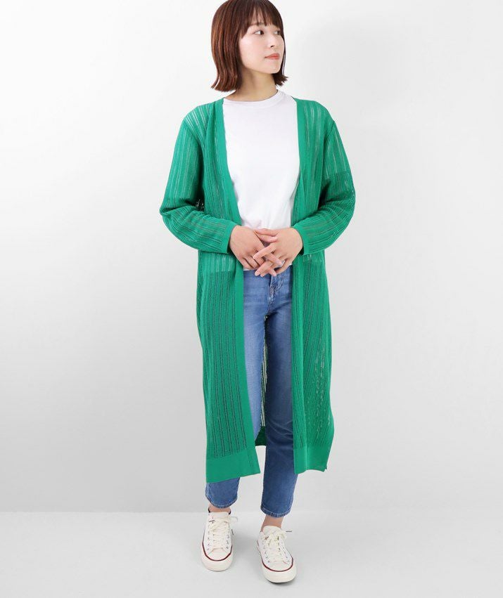 ・ストライプ状に入った編み柄の透け感が涼しげで、季節感のある軽快なスタイリングに