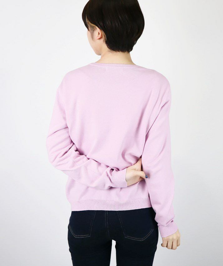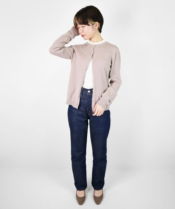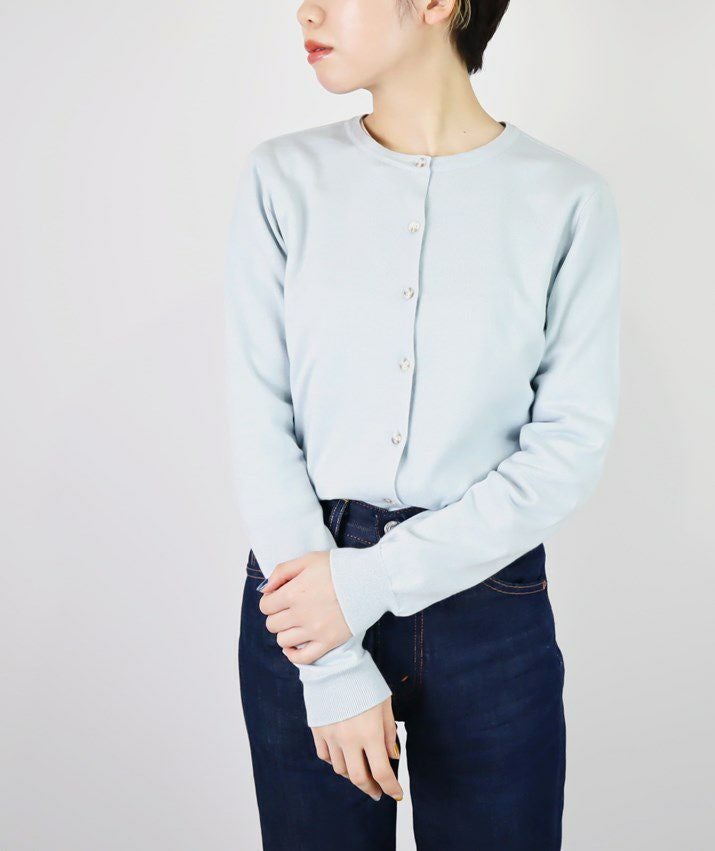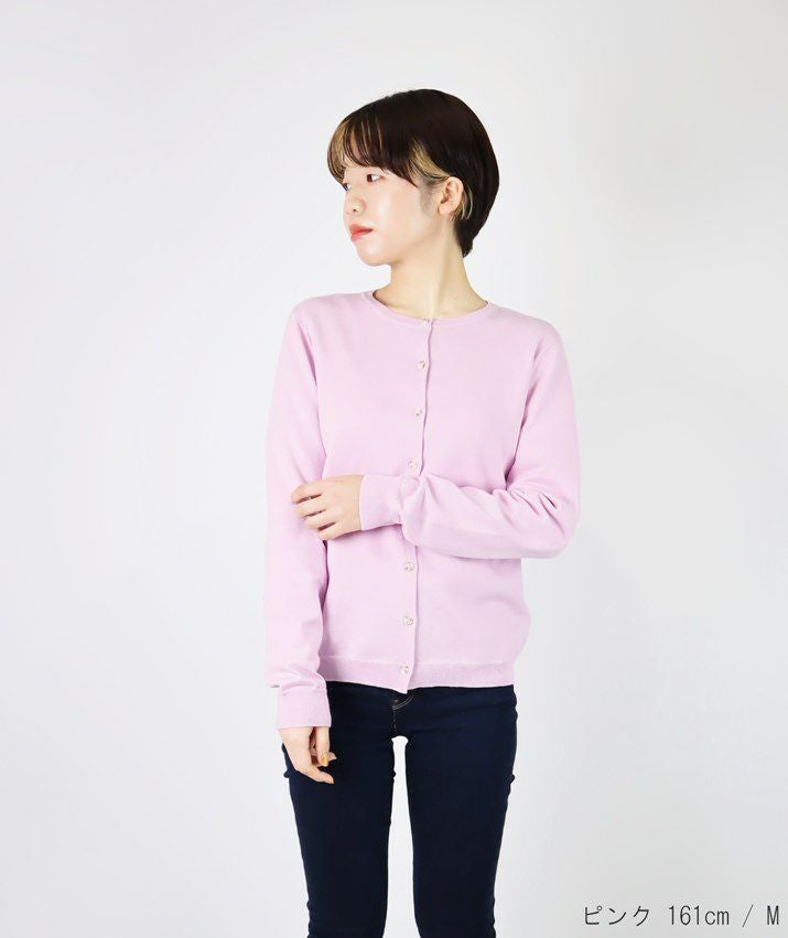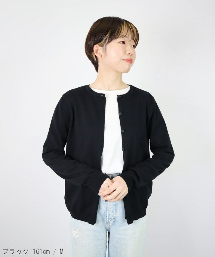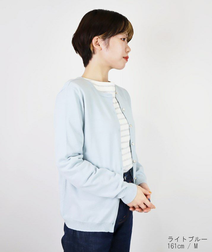 シンプルで飽きのこないベーシックなデザインのVネックカーディガン。16ゲージの天竺編みで薄手の仕上がりなので、季節の変わり目の温度調節や冷房対策としても重宝します。すっきりとしたシルエットはきちんと感のある印象で、オフィスカジュアルにもぴったり。