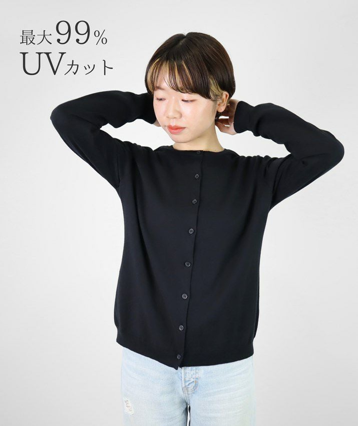 しなやかなカシミヤとなめらかな超長綿をブレンドしたコットンカシミヤ素材を使用。ふんわりやわらかな風合いと軽やかな着心地が魅力です。自宅で手洗いできるので、お手入れも簡単。さらに、最大99%*の紫外線をカットするUVカット機能付きで、日差しの気になる季節にも心強い一枚です。(*紫外線を最も遮るといわれているブラックでの試験結果)