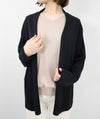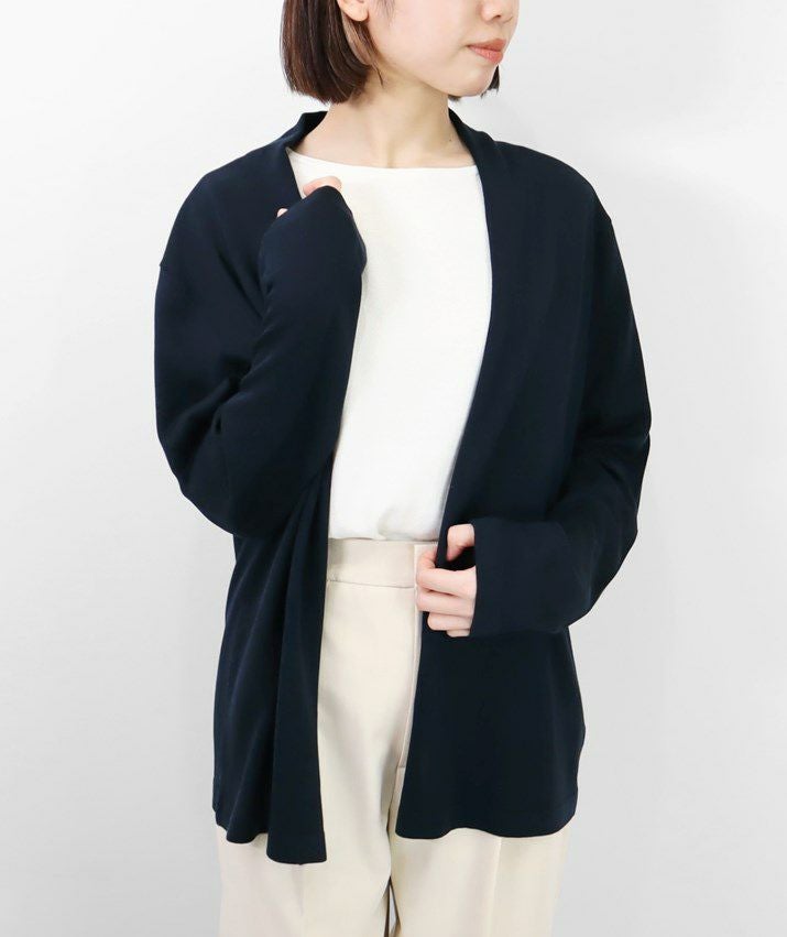 編地は16ゲージのフロート編み。薄手でやや透け感があります。シルクならではの上品な光沢と滑らかな肌触りが魅力です。後ろ衿を立ち上げ、衿から続く前端が自然と内側に巻くデザインでふわっとやわらかいニュアンスに仕上げました。ヒップが隠れる丈感とゆったりしたシルエットで、さりげなく体型もカバーしてくれます。