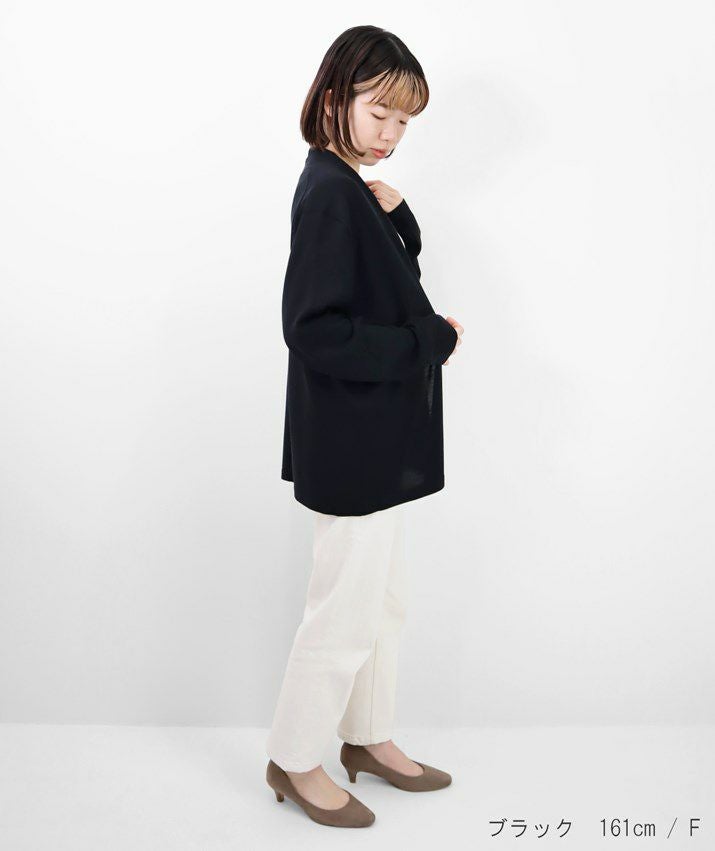 どんなボトムともバランスよく合わせやすく、カジュアルからキレイめまで幅広い着こなしが楽しめます。同素材のプルオーバーとセットでの着用もおすすめ。軽くてかさばらないため、出先での紫外線や冷房対策としても重宝します。