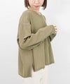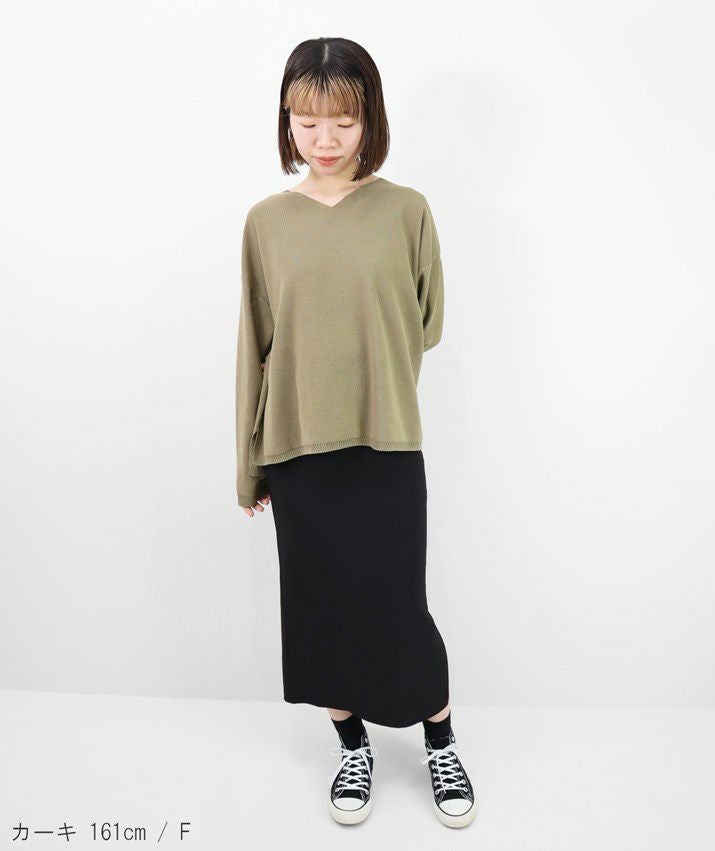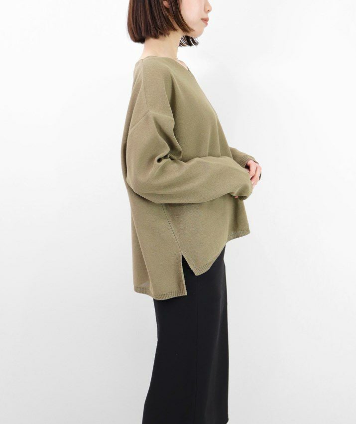 編地は12ゲージの天竺裏目使い。程よい透け感が上品で涼し気な印象に。ワイドなシルエットながらもサイドスリットが入っているのですっきりと抜け感のある着こなしに。前後差のある裾は体型カバー効果も◎深すぎないVネックが、デコルテをすっきりと見せてくれます。