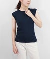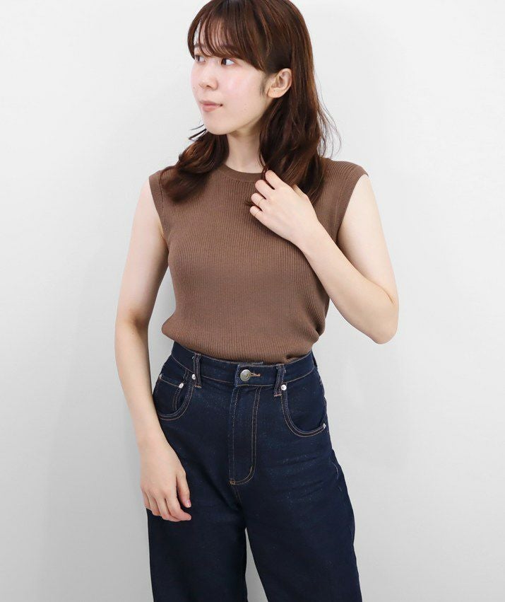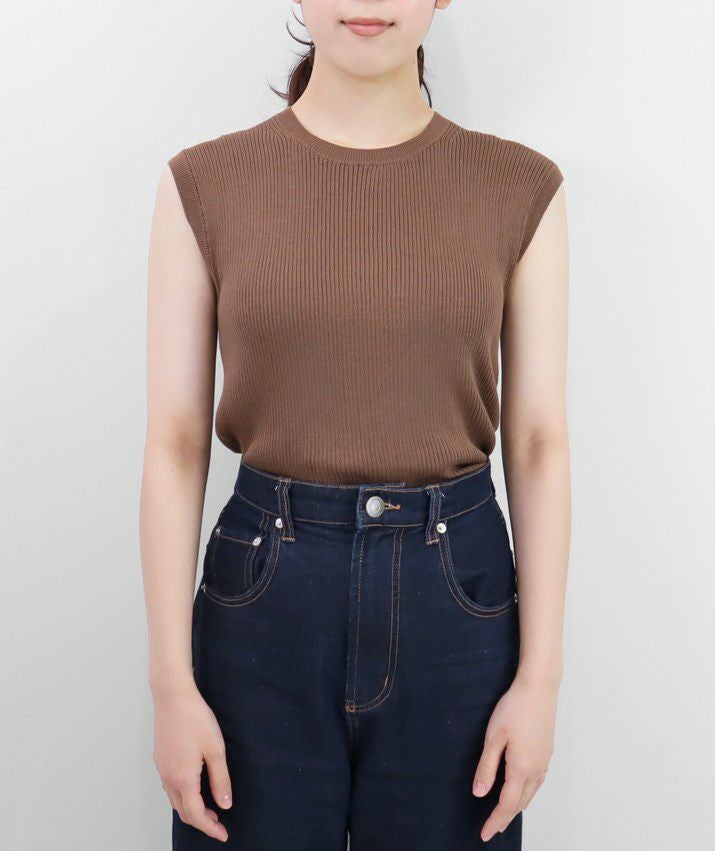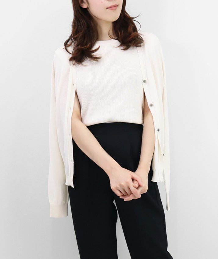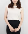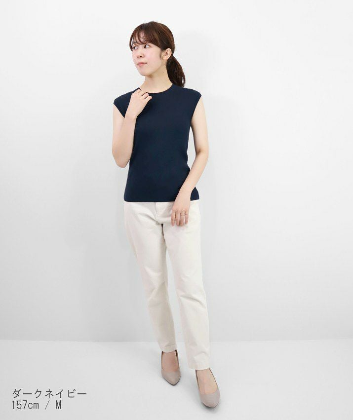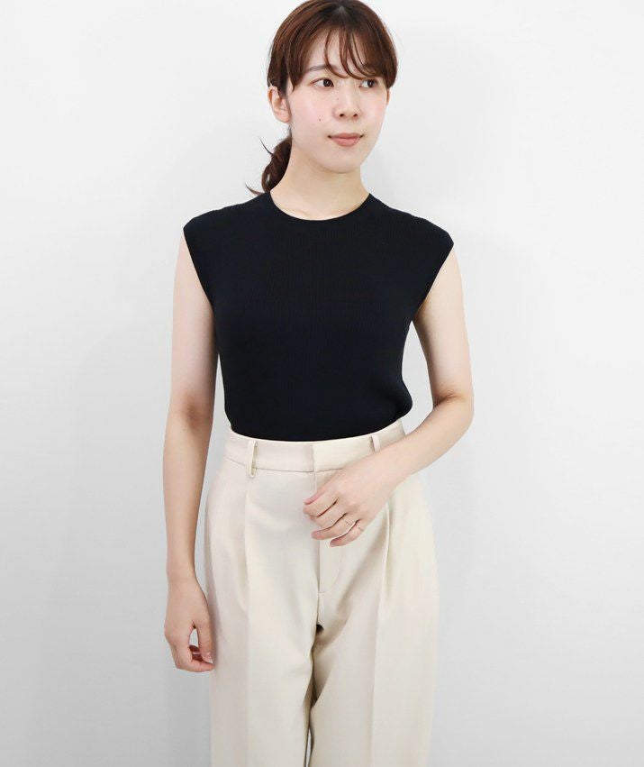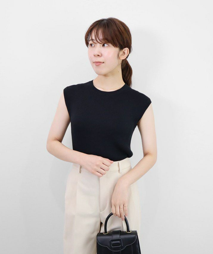 編地は14ゲージのリブ編み。糸を2本取りで使用することで程よい厚みと上品な光沢をプラス。コンパクトなシルエットですが伸縮性があり、締め付け感のないやわらかな着心地。ほどよく肩にかかる絶妙な袖丈で、ノースリーブに抵抗がある大人世代にも取り入れやすい1枚です。