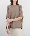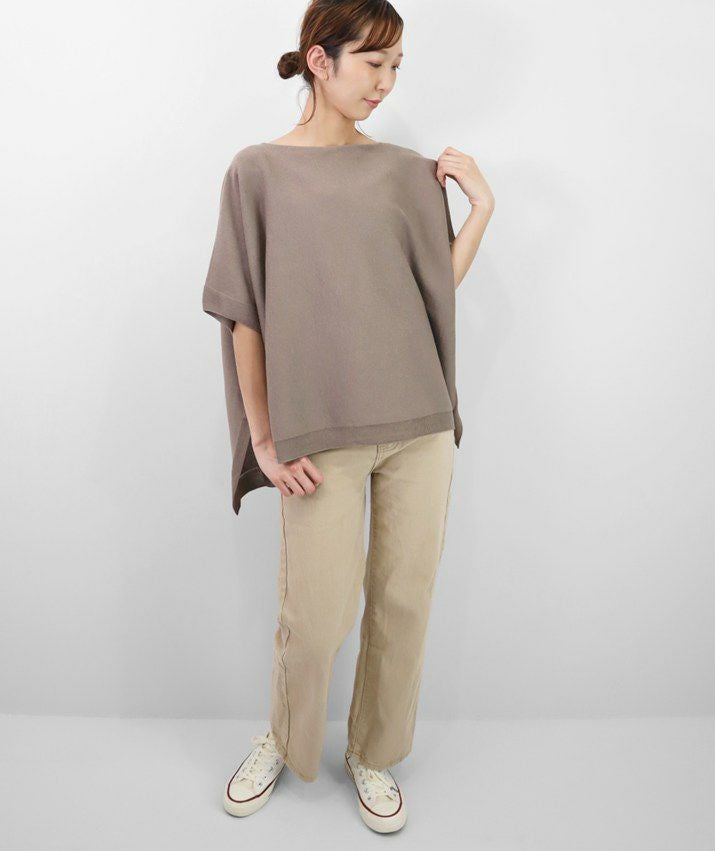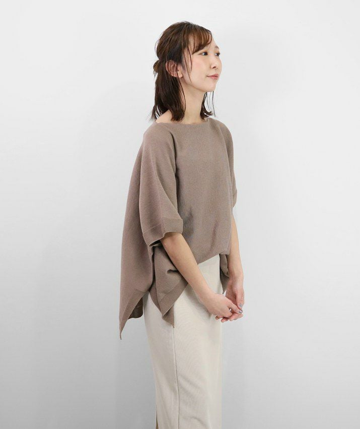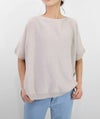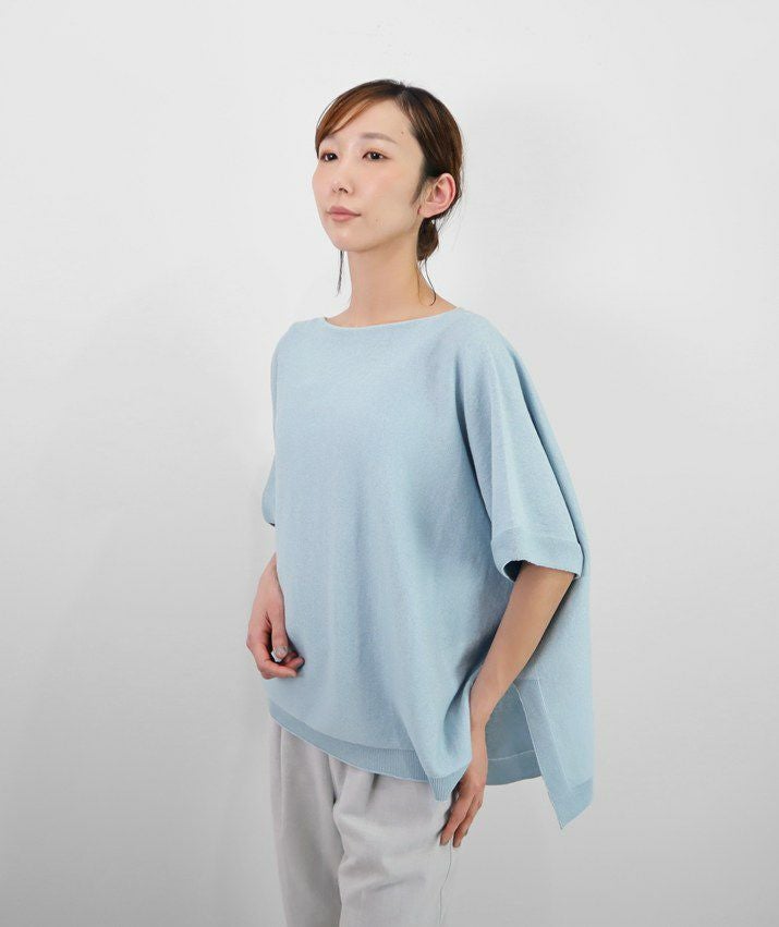 ホールガーメントで編み立てた12ゲージの天竺編みを横地使いすることで、シンプルながらもニュアンスのある表情に。ワイドな身幅と前後差のある裾が、二の腕や腰まわりを自然にカバー。落ち感のあるゆったりシルエットで、すっきりとした印象に。デコルテをきれいに見せてくれるネックラインと、ガーター編みの袖口&裾がさりげないアクセントに。