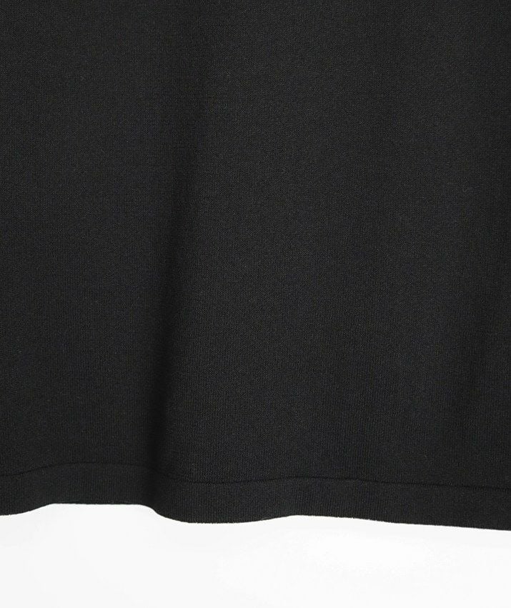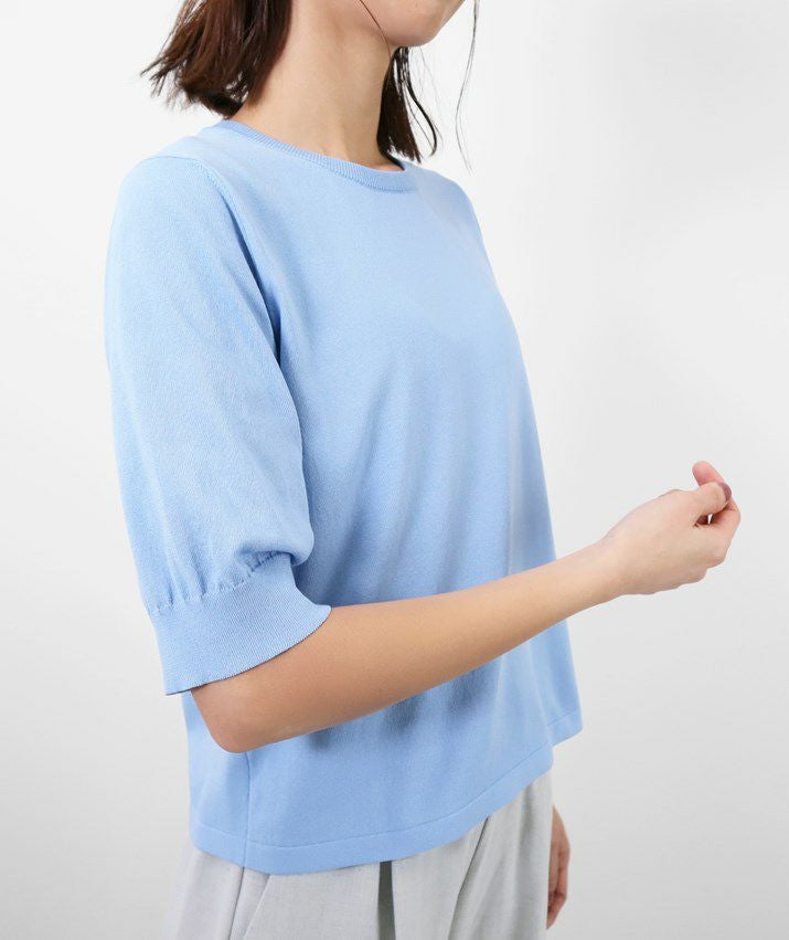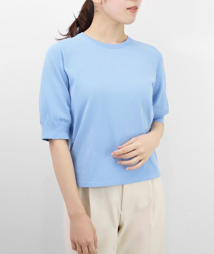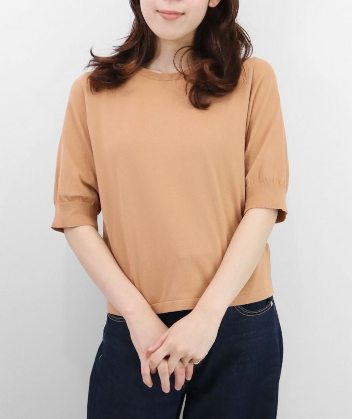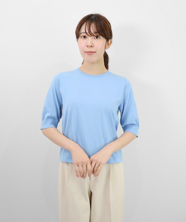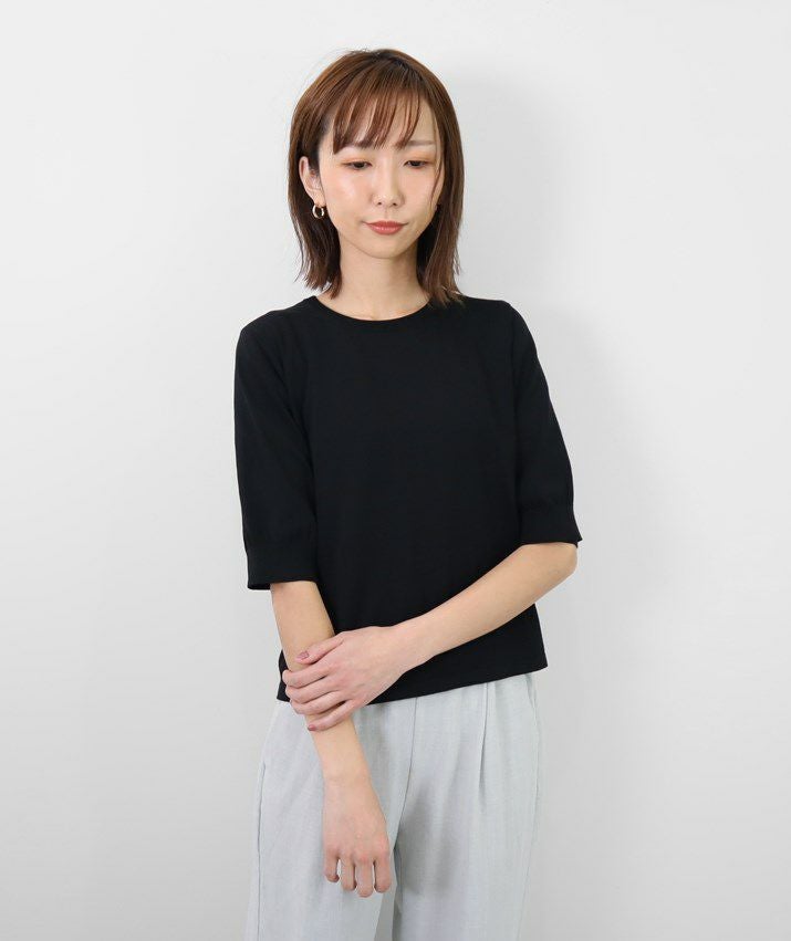 編地は16ゲージの天竺編み。ハイゲージの上品な薄さを活かしながら、ポリエステルのストレッチ性によって透けにくく、適度なハリのある風合いに仕上げました。自然と視線が上がるコンパクトな丈感で、脚長効果も◎ふんわりとした長めの袖と、きゅっと締まった袖口のリブが女性らしく上品な印象に。