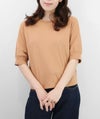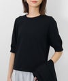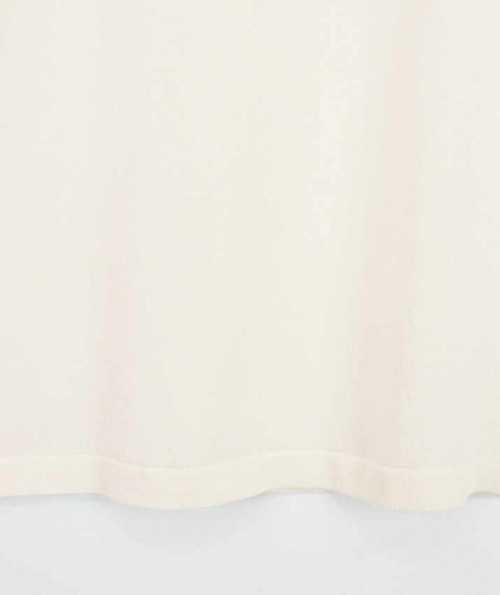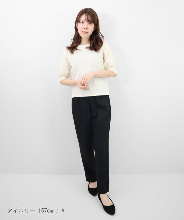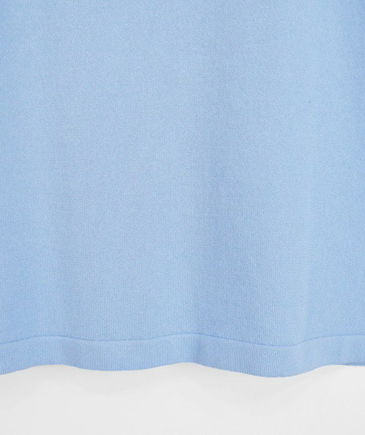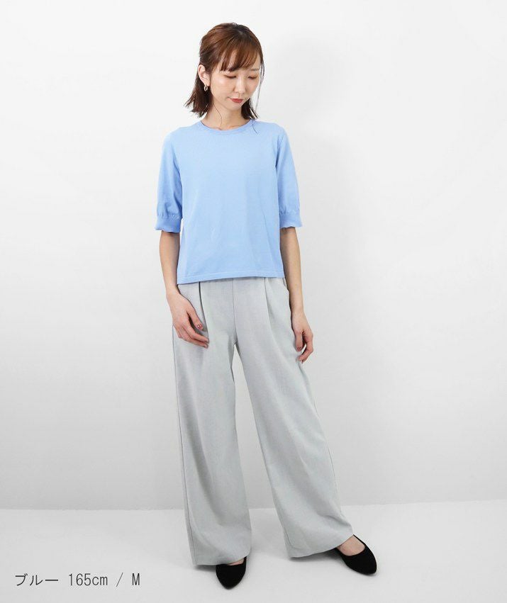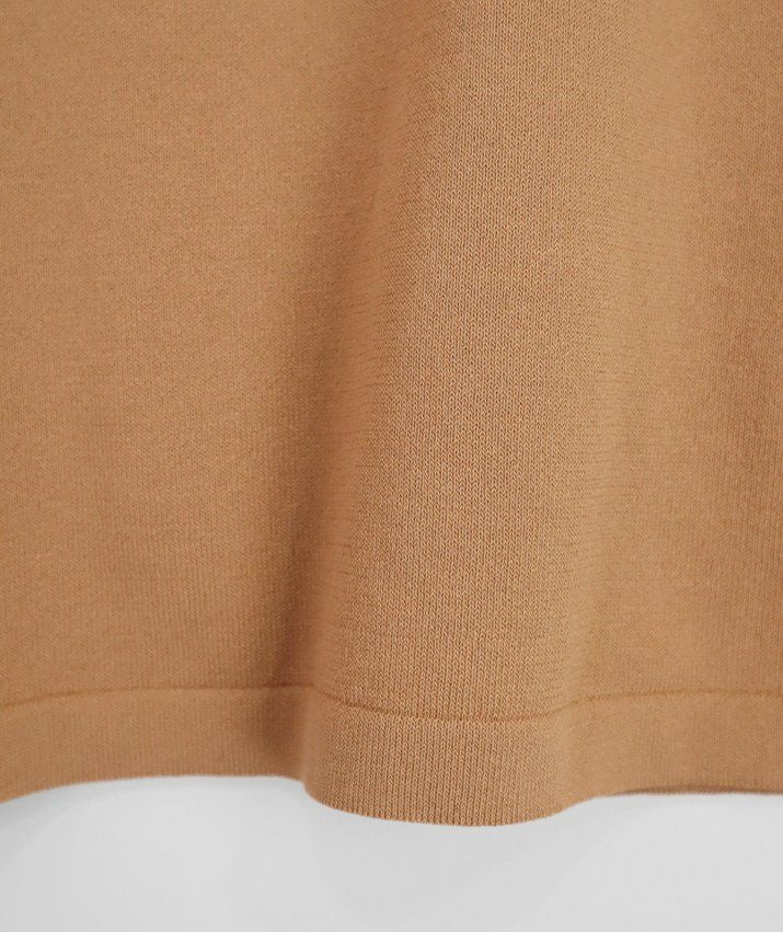 編地は16ゲージの天竺編み。ハイゲージの上品な薄さを活かしながら、ポリエステルのストレッチ性によって透けにくく、適度なハリのある風合いに仕上げました。自然と視線が上がるコンパクトな丈感で、脚長効果も◎ふんわりとした長めの袖と、きゅっと締まった袖口のリブが女性らしく上品な印象に。