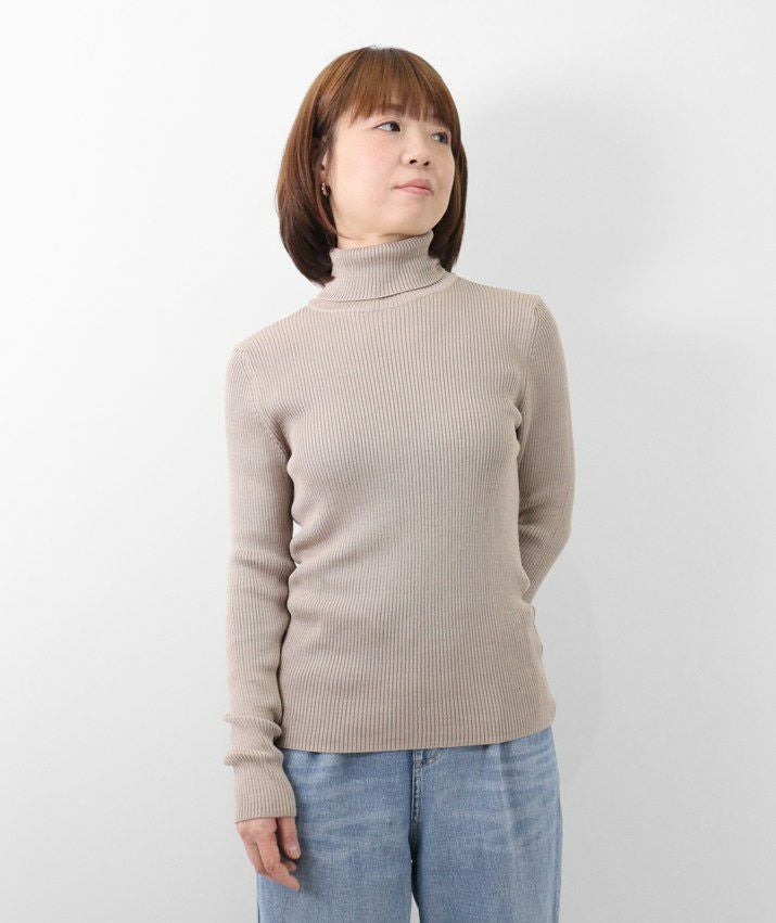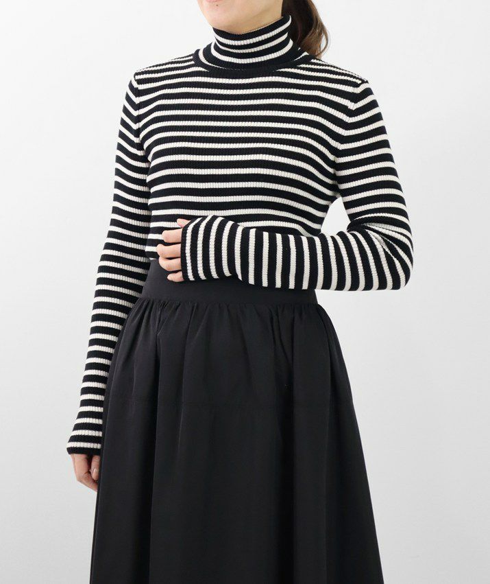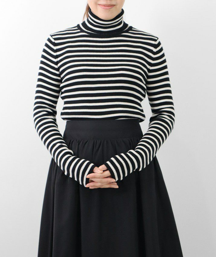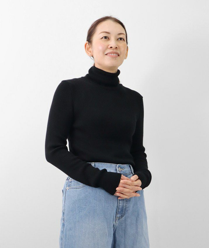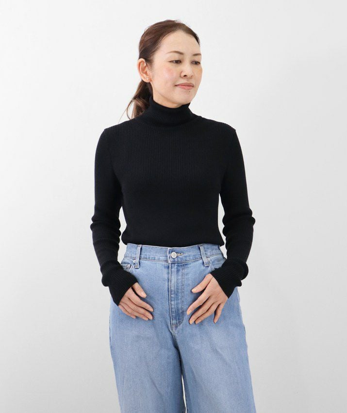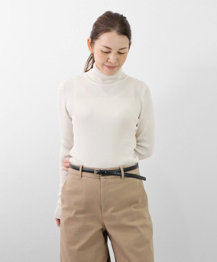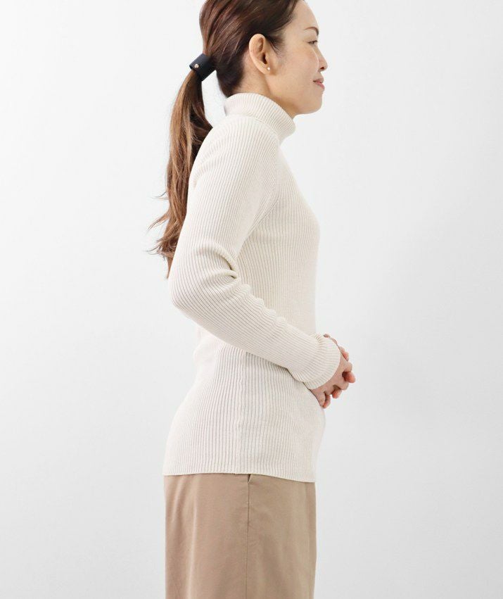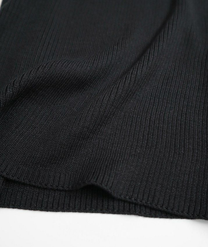編地は14ゲージのリブ編み。糸を2本取りで使用することで程よい厚みと上品な光沢をプラス。コンパクトなシルエットながら、伸縮性があり、締め付け感のないやわらかな着心地。無駄をそぎ落とした洗練されたデザインで、流行に左右されず、長くご愛用いただける一枚です。