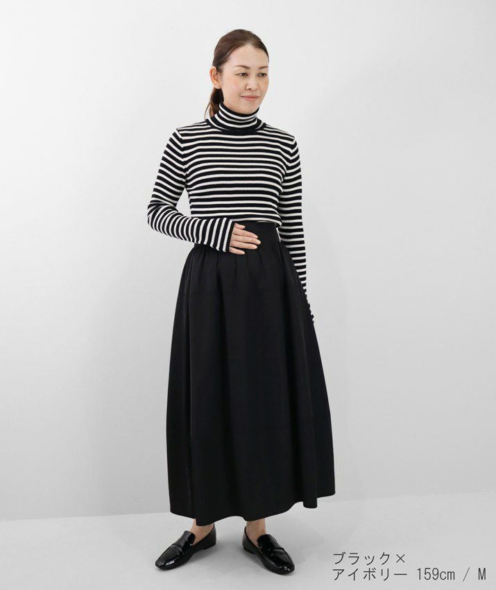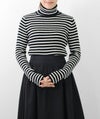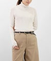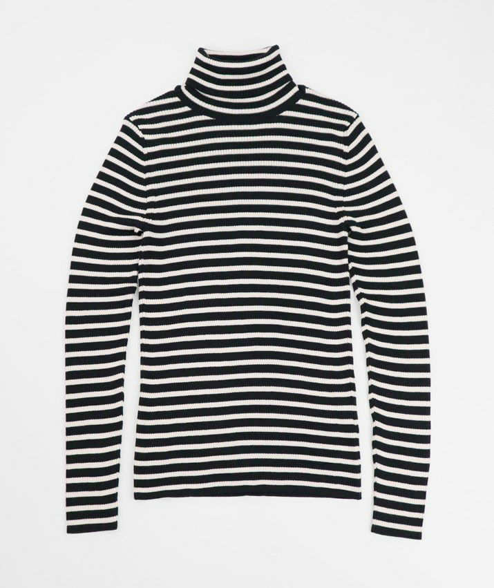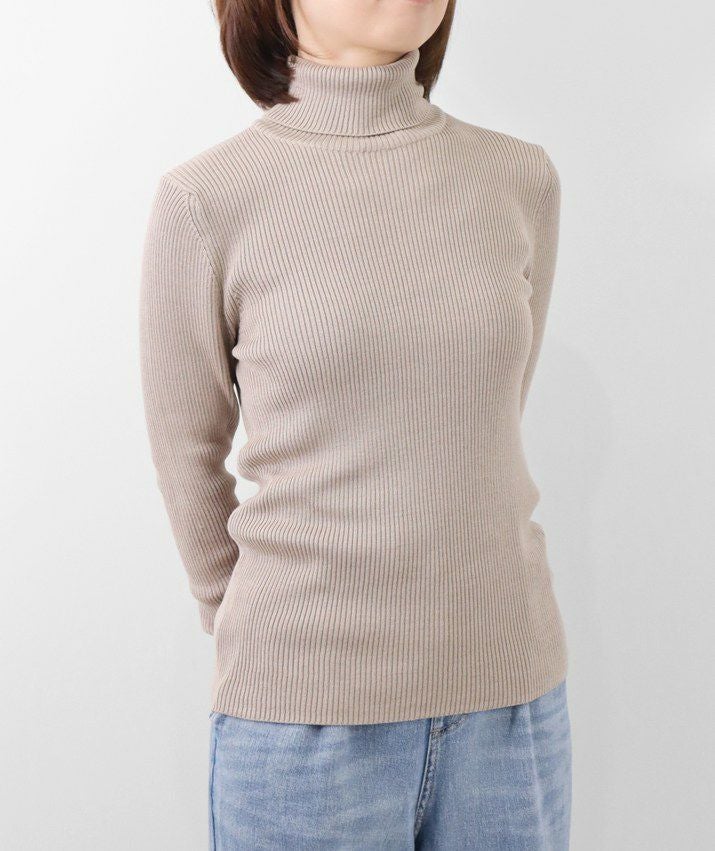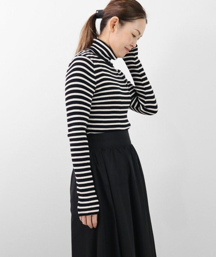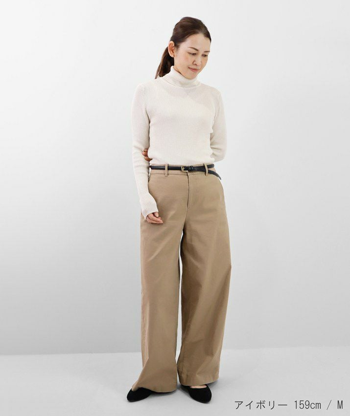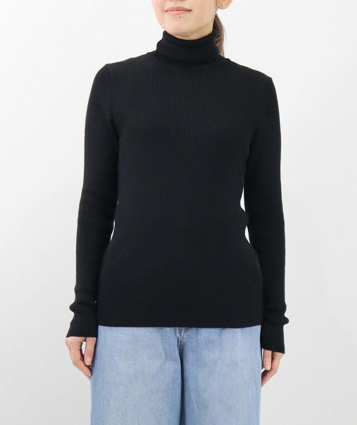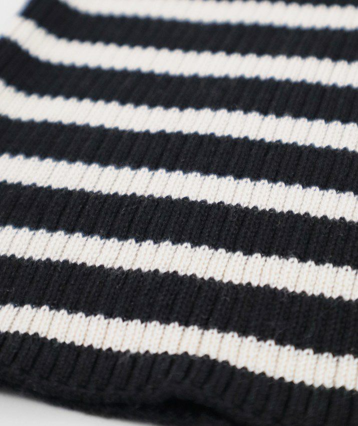 編地は14ゲージのリブ編み。糸を2本取りで使用することで程よい厚みと上品な光沢をプラス。コンパクトなシルエットながら、伸縮性があり、締め付け感のないやわらかな着心地。無駄をそぎ落とした洗練されたデザインで、流行に左右されず、長くご愛用いただける一枚です。