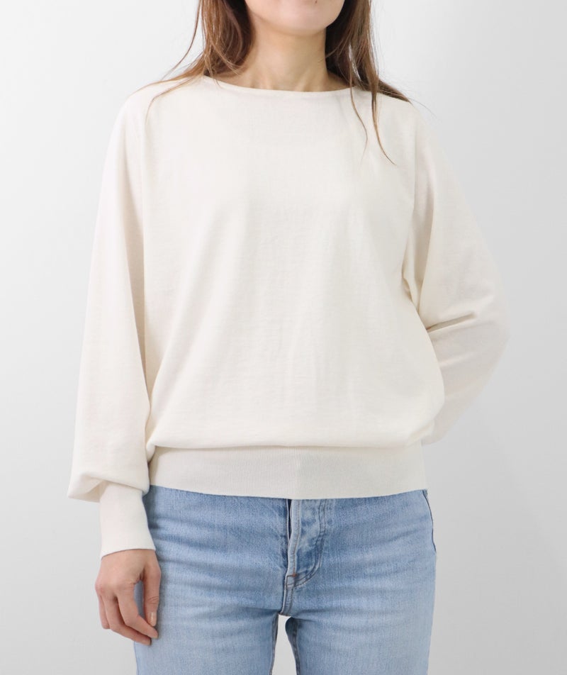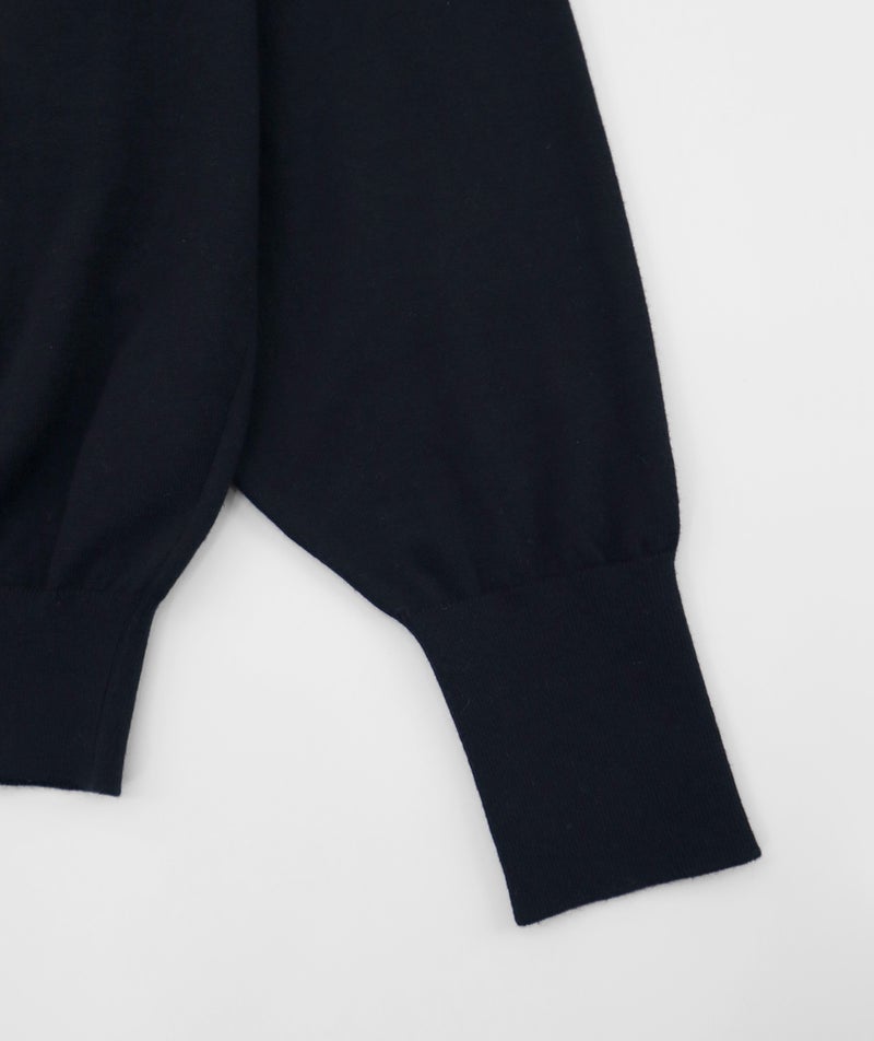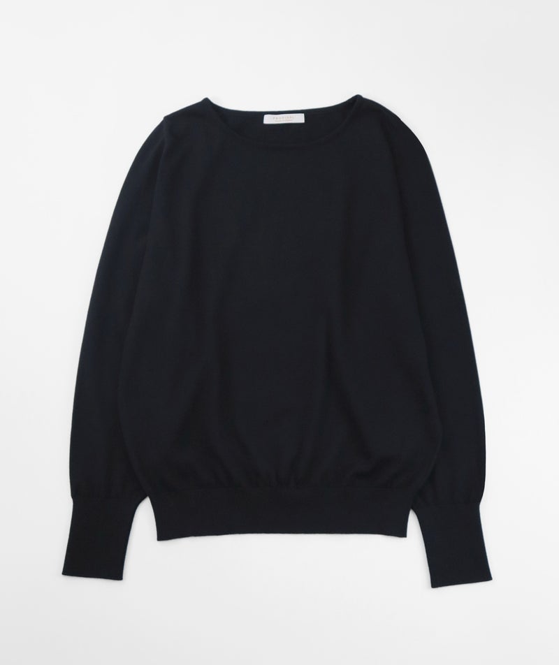 16ゲージの天竺編みで、編み目の目立たないプレーンな表情に。程よい丸みとボリュームをもたせた袖が、さりげなくフェミニンな印象を演出します。長めに設定した裾と袖口のリブが、スタイリングにほどよいアクセントをプラス。