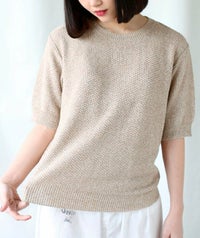 手持ちのTシャツのサイズを頼りに今回Sサイズを購入。 細かな凸凹した編み地が肌触りよく柔らかいのに、だらしなく弛むわけでもなく、すっきりしたシルエットで着られます。 グレーの入った淡いブルーが手持ちの夏物合って良かったです!